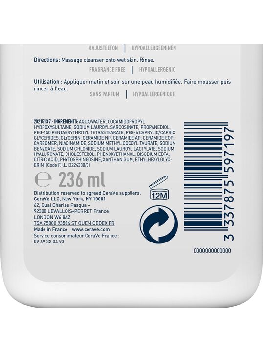 AQUA/WATER, COCAMIDOPROPYL HYDROXYSULTAINE, SODIUM LAUROYL SARCOSINATE, PROPANEDIOL, PEG-150 PENTAERYTHRITYL TETRASTEARATE, PEG-6 CAPRYLIC/ CAPRIC GLYCERIDES, GLYCERIN, CERAMIDE NP, CERAMIDE AP, CERAMIDE EOP, CARBOMER, NIACINAMIDE, SODIUM METHYL COCOYL TAURATE, SODIUM BENZOATE, SODIUM CHLORIDE, SODIUM LAUROYL LACTYLATE, SODIUM HYALURONATE, CHOLESTEROL, PHENOXYETHANOL, DISODIUM EDTA, CITRIC ACID, TETRASODIUM EDTA, PHYTOSPHINGOSINE, XANTHAN GUM, ETHYLHEXYLGLYCERIN