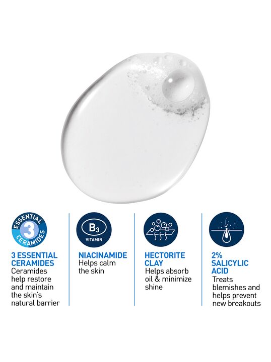 Разработано совместно с дерматологами: очищающий гель-пенка с 2% салициловой кислотой для борьбы с несовершенствами, а также очищающей глиной для интенсивного уменьшения жирности кожи без сухости и дискомфорта. Формула с ниацинамидом и 3 необходимыми церамидами. Это мягкое очищающее средство устраняет несовершенства, одновременно помогая восстановить защитный барьер кожи.