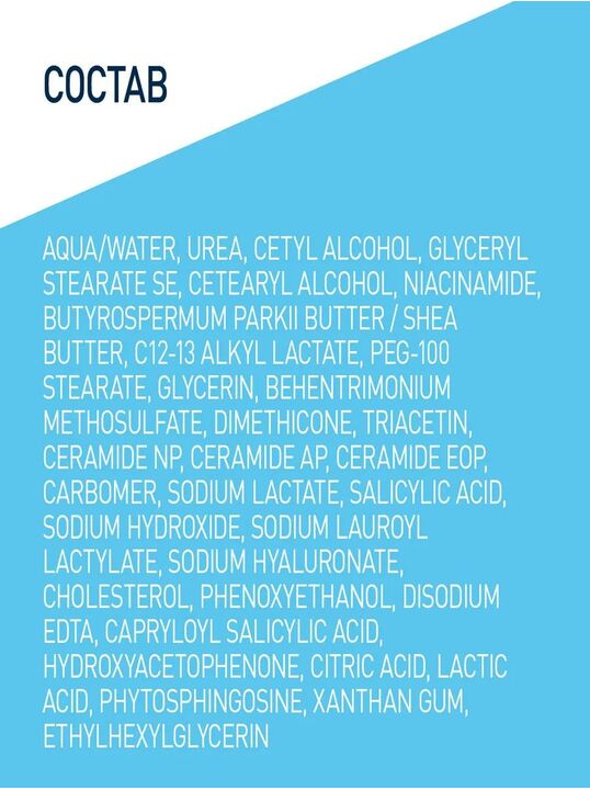 AQUA/WATER, UREA, CETYL ALCOHOL, GLYCERYL STEARATE SE, CETEARYL ALCOHOL, NIACINAMIDE, BUTYROSPERMUM PARKII BUTTER / SHEA BUTTER, C12-13 ALKYL LACTATE, PEG-100 STEARATE, GLYCERIN, BEHENTRIMONIUM METHOSULFATE, DIMETHICONE, TRIACETIN, CERAMIDE NP, CERAMIDE AP, CERAMIDE EOP, CARBOMER, SODIUM LACTATE, SALICYLIC ACID, SODIUM HYDROXIDE, SODIUM LAUROYL LACTYLATE, SODIUM HYALURONATE, CHOLESTEROL, PHENOXYETHANOL, DISODIUM EDTA, CAPRYLOYL SALICYLIC ACID, HYDROXYACETOPHENONE, CITRIC ACID, LACTIC ACID, PHYTOSPHINGOSINE, XANTHAN GUM, ETHYLHEXYLGLYCERIN