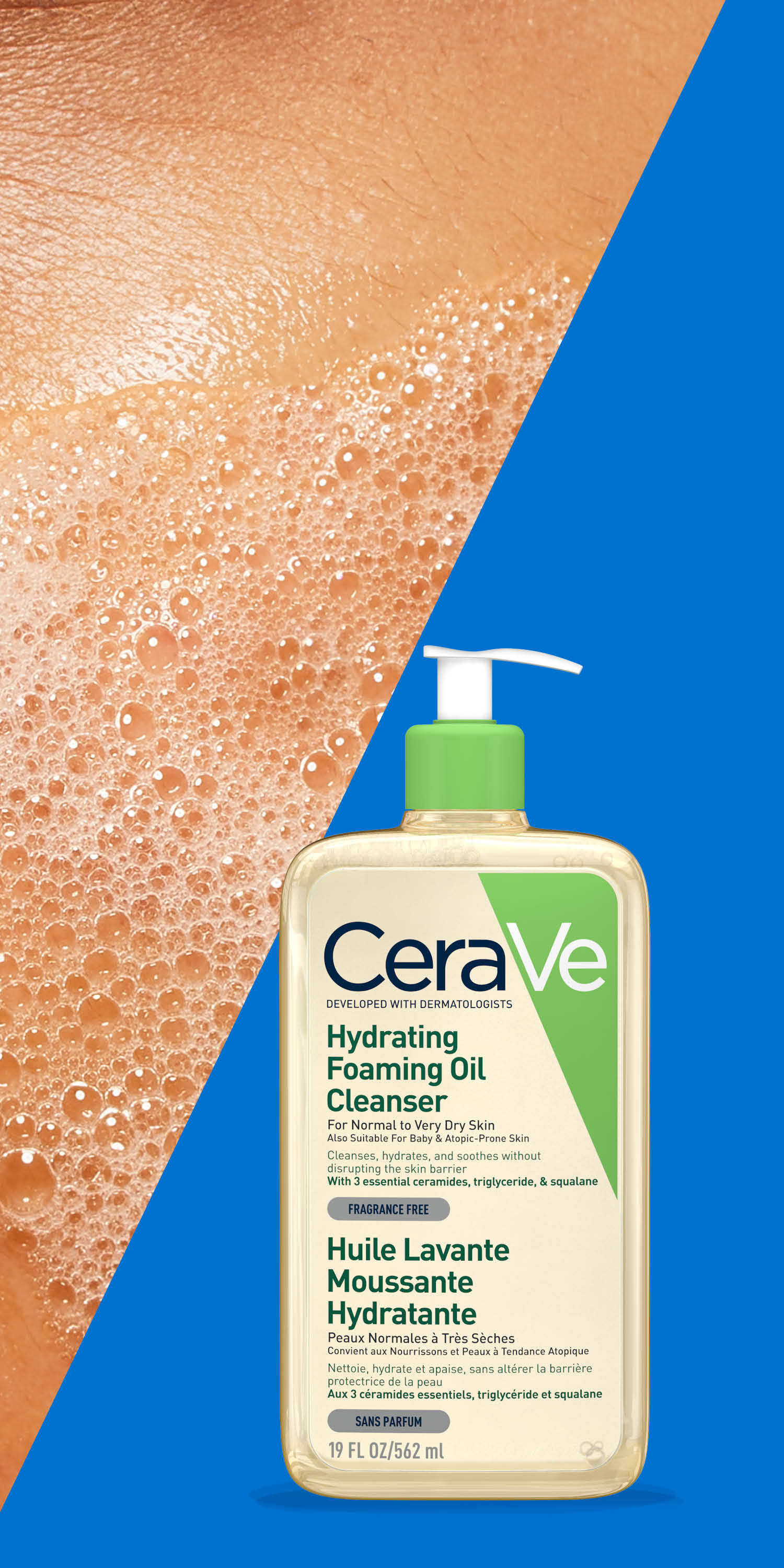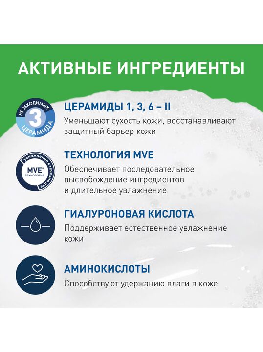 Деликатная формула без мыла и отдушек содержит 3 незаменимых церамида, которые помогают удерживать влагу в коже и восстанавливать ее защитный барьер, а также гиалуроновую кислоту, препятствующую трансэпидермальной потере влаги.