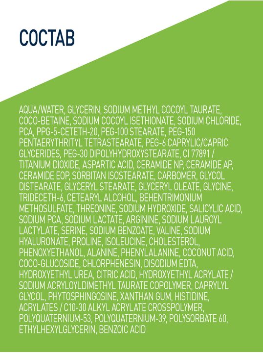 AQUA/WATER, GLYCERIN, SODIUM METHYL COCOYL TAURATE, COCO-BETAINE, SODIUM COCOYL ISETHIONATE, SODIUM CHLORIDE, PCA, PPG-5-CETETH-20, PEG-100 STEARATE, PEG-150 PENTAERYTHRITYL TETRASTEARATE, PEG-6 CAPRYLIC/CAPRIC GLYCERIDES, PEG-30 DIPOLYHYDROXYSTEARATE, CI 77891 / TITANIUM DIOXIDE, ASPARTIC ACID CERAMIDE NP, CERAMIDE AP, CERAMIDE EOP, SORBITAN ISOSTEARATE, CARBOMER, GLYCOL DISTEARATE, GLYCERYL STEARATE, GLYCERYL OLEATE, GLYCINE, TRIDECETH-6, CETEARYL ALCOHOL, BEHENTRIMONIUM METHOSULFATE, THREONINE, SODIUM HYDROXIDE, SALICYLIC ACID, SODIUM PCA, SODIUM LACTATE, ARGININE, SODIUM LAUROYL LACTYLATE, SERINE, SODIUM BENZOATE, VALINE, SODIUM HYALURONATE, PROLINE, ISOLEUCINE, CHOLESTEROL, PHENOXYETHANOL, ALANINE, PHENYLALANINE, COCONUT ACID, COCO-GLUCOSIDE, CHLORPHENESIN, DISODIUM EDTA, HYDROXYETHYL UREA, CITRIC ACID, HYDROXYETHYL ACRYLATE / SODIUM ACRYLOYLDIMETHYL TAURATE COPOLYMER, CAPRYLYL GLYCOL, PHYTOSPHINGOSINE, XANTHAN GUM, HISTIDINE, ACRYLATES / C10-30 ALKYL ACRYLATE CROSSPOLYMER, POLYQUATERNIUM-53, POLYQUATERNIUM-39, POLYSORBATE 60, ETHYLHEXYLGLYCERIN, BENZOIC ACID