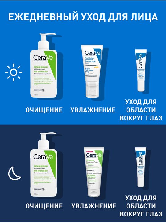 Описание: Увлажняющая крем-пенка для умывания CeraVe при контакте с водой трансформируется из крема в нежную пенку, и мягко, но эффективно удаляет с поверхности кожи загрязнения и макияж. Аминоксилоты в составе средства увлажняют кожу уже в процессе очищения. Таким образом крем-пенка обеспечивает эффективное ощущение чистоты без ощущения сухости и стянутости кожи.
