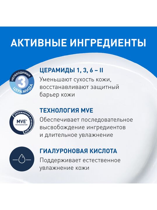 В основе формулы – 3 церамида, необходимых для восстановления и укрепления защитного барьера кожи, запатентованная технология MVE, обеспечивающая постепенное высвобождение активных ингредиентов и гиалуроновая кислота, поддерживающая увлажненность кожи в течение дня.