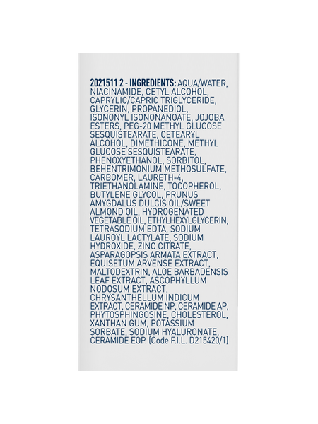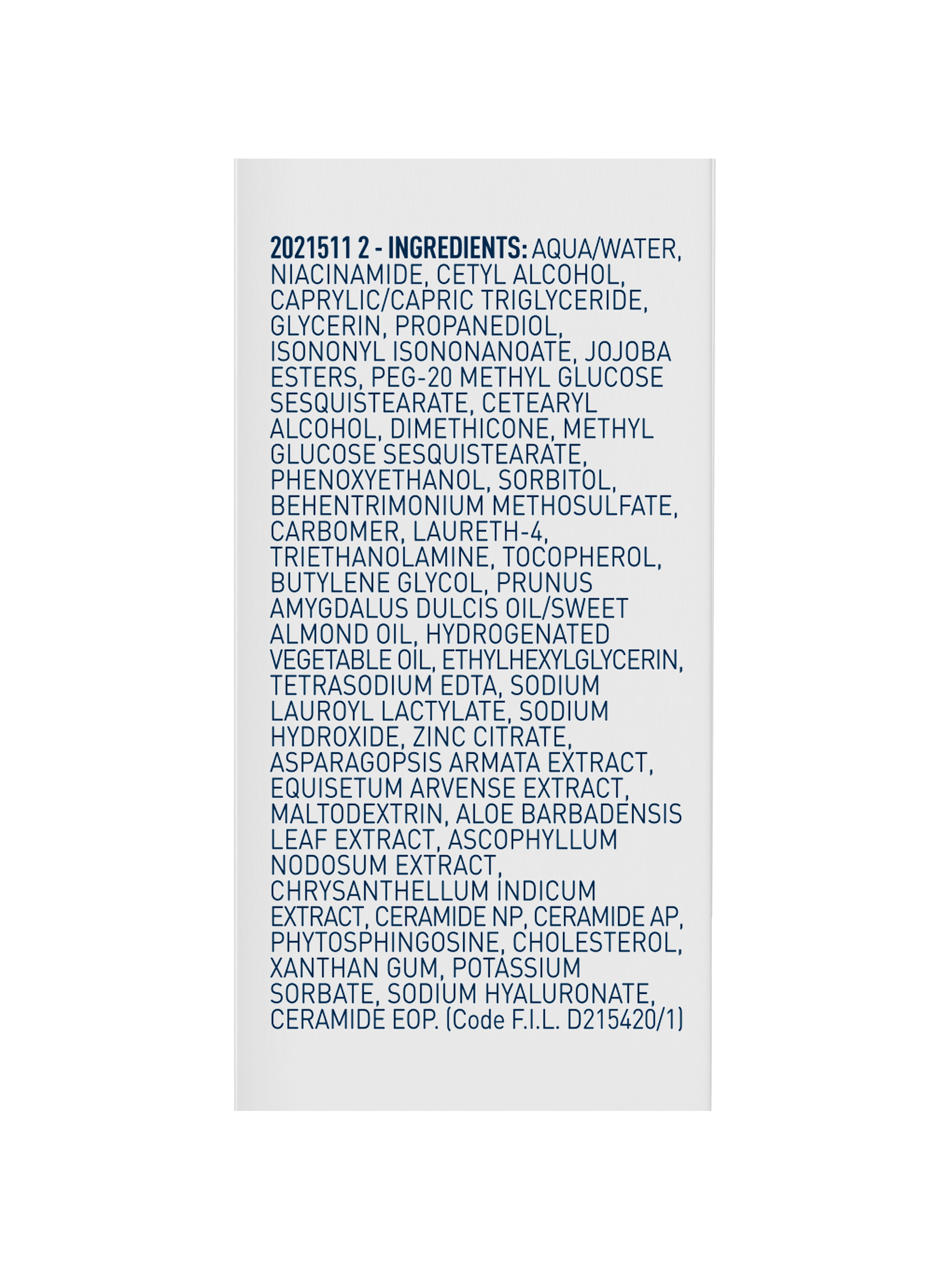 AQUA / WATER, NIACINAMIDE, CETYL ALCOHOL, CAPRYLIC/CAPRIC TRIGLYCERIDE, GLYCERIN, PROPANEDIOL, ISONONYL ISONONANOATE, JOJOBA ESTERS, PEG-20 METHYL GLUCOSE SESQUISTEARATE, CETEARYL ALCOHOL, DIMETHICONE, METHYL GLUCOSE SESQUISTEARATE, PHENOXYETHANOL, SORBITOL, BEHENTRIMONIUM METHOSULFATE, CARBOMER, LAURETH-4, TRIETHANOLAMINE, TOCOPHEROL, BUTYLENE GLYCOL, PRUNUS AMYGDALUS DULCIS OIL / SWEET ALMOND OIL, HYDROGENATED VEGETABLE OIL, ETHYLHEXYLGLYCERIN, TETRASODIUM EDTA, SODIUM LAUROYL LACTYLATE, SODIUM HYDROXIDE, ZINC CITRATE, ASPARAGOPSIS ARMATA EXTRACT, EQUISETUM ARVENSE EXTRACT ,MALTODEXTRIN, ALOE BARBADENSIS LEAF EXTRACT, ASCOPHYLLUM NODOSUM EXTRACT, CHRYSANTHELLUM INDICUM EXTRACT, CERAMIDE NP, CERAMIDE AP, PHYTOSPHINGOSINE, CHOLESTEROL, XANTHAN GUM, POTASSIUM SORBATE, SODIUM HYALURONATE, CERAMIDE EOP