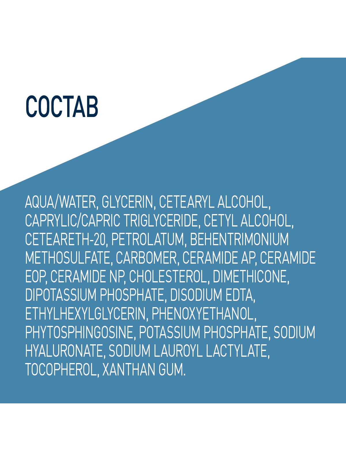 AQUA / WATER, GLYCERIN, CETEARYL ALCOHOL, CAPRYLIC/CAPRIC TRIGLYCERIDE, CETYL ALCOHOL, CETEARETH-20, PETROLATUM, BEHENTRIMONIUM METHOSULFATE, CARBOMER, CERAMIDE AP, CERAMIDE EOP, CERAMIDE NP, CHOLESTEROL, DIMETHICONE, DIPOTASSIUM PHOSPHATE, DISODIUM EDTA, ETHYLHEXYLGLYCERIN, PHENOXYETHANOL, PHYTOSPHINGOSINE, POTASSIUM PHOSPHATE, SODIUM HYALURONATE, SODIUM LAUROYL LACTYLATE, TOCOPHEROL, XANTHAN GUM