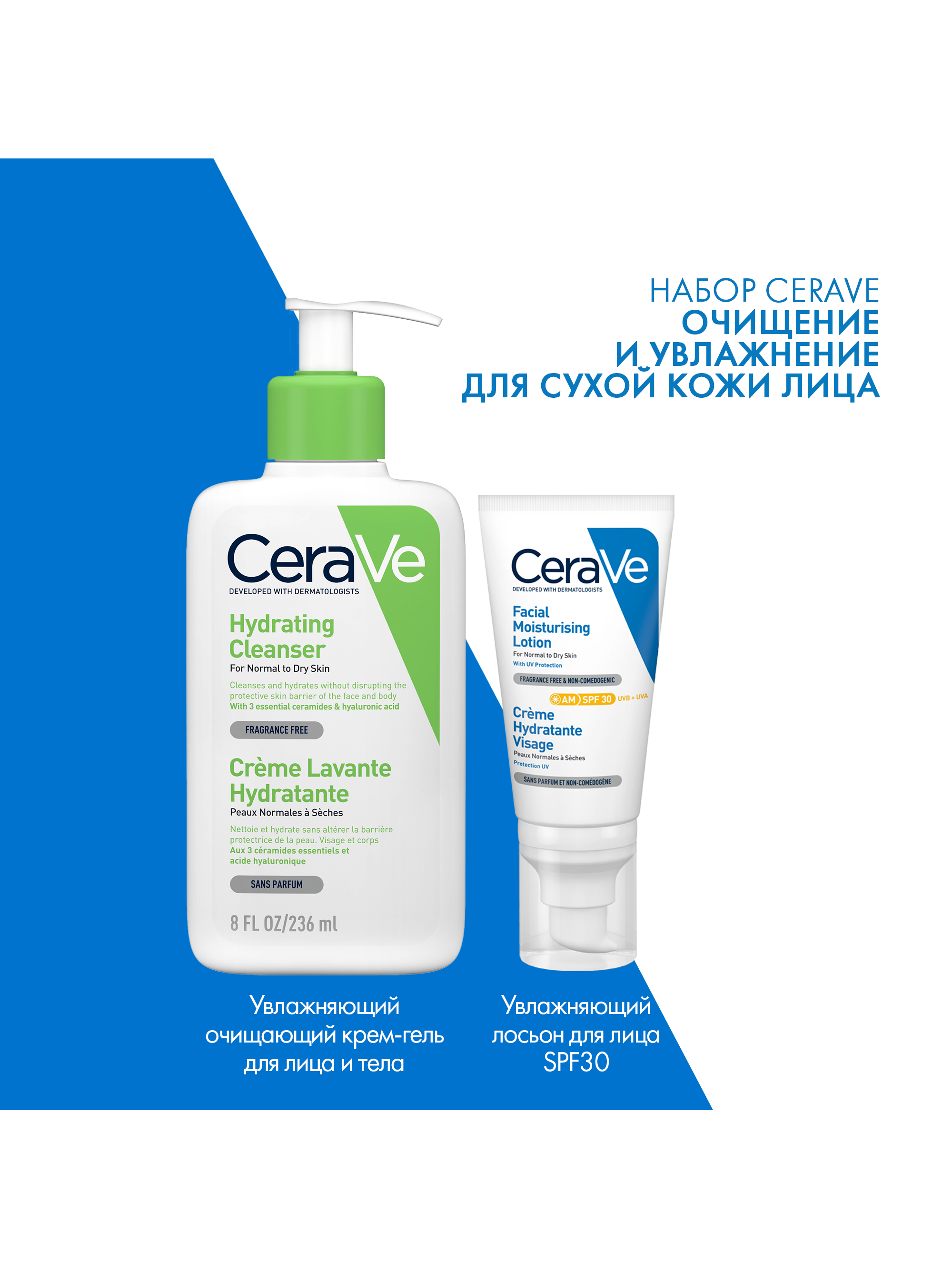 Cerave Набор Увлажняющий очищающий крем-гель для нормальной и сухой кожи лица и тела, 236 мл + Увлажняющий уход за кожей SPF 30 52мл