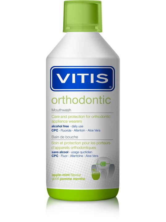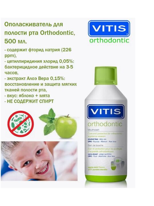 Ортодонтический ополаскиватель для рта VITIS® обладает действием против зубного налета и реминерализации эмали и содержит активные ингредиенты, необходимые ежедневно для поддержания здоровья полости рта. Он усиливает действие зубной щетки и зубной пасты, поскольку достигает труднодоступных участков вокруг ортодонтических приспособлений и помогает активным компонентам дольше оставаться во рту.