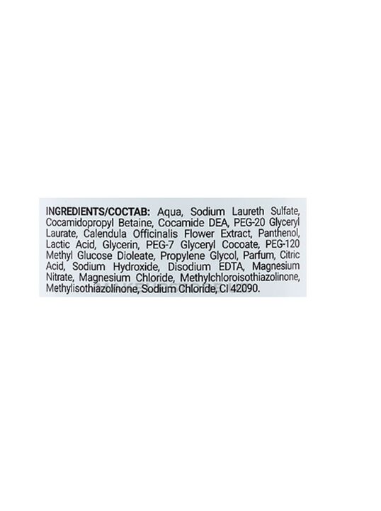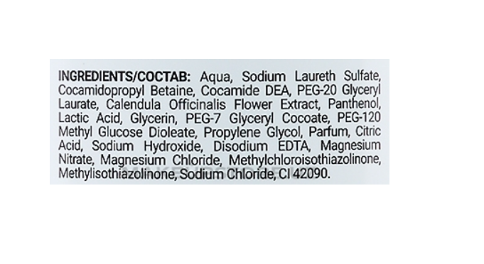 INCI:Aqua, Sodium Laureth Sulfate, Cocamidopropyl Betaine, Cocamide DEA, PEG-20 Glyceryl Laurate, Salvia Officinalis Leaf Extract, Panthenol, Lactic Acid, Glycerin, PEG-7 Glyceryl Cocoate, PEG-120 Methyl Glucose Dioleate, Propylene Glycol, Parfum, Citric Acid, Sodium Hydroxide, Disodium EDTA, Magnesium Nitrate, Magnesium Chloride, Methylchloroisothiazolinone, Methylisothiazolinone, Sodium Chloride, CI 17200.