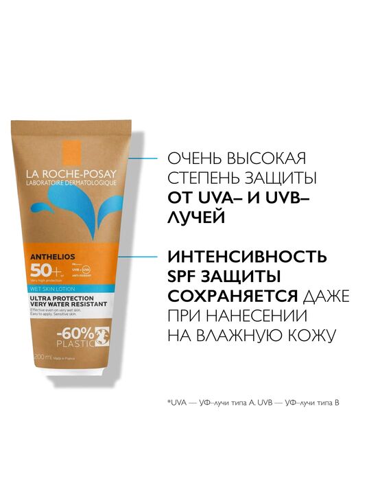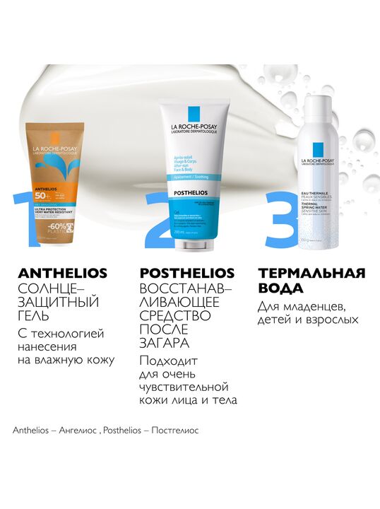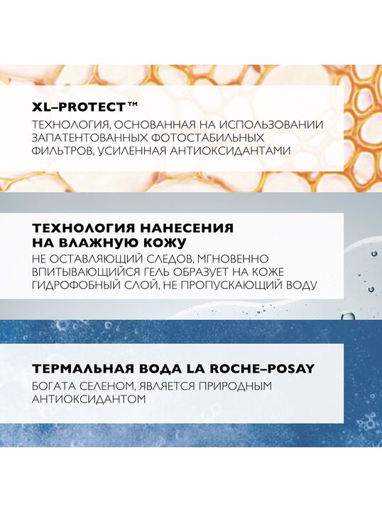 Солнцезащитное средство для лица и тела с технологией нанесения на влажную кожу в новой экологичной упаковке. Для всех типов кожи, включая чувствительную и склонную к аллергии на солнце. Запатентованные фотостабильные фильтры, усиленные антиоксидантами, обеспечивают широкий спектр защиты от UVA-, UVB-лучей и нейтрализуют свободные радикалы, в том числе образовавшиеся в результате инфракрасного излучения. Легкая нежирная текстура удобно наносится как на сухую, так и на влажную кожу. Гель мгновенно впитывается и образует гидрофобный слой, не пропускающий воду. При нанесении на влажную кожу интенсивность SPF-защиты сохраняется. Не оставляет липкости и белых следов. Водостойкая формула. Протестировано под контролем дерматологов. Термальная вода LA ROCHE-POSAY, богатая Селеном, является природным антиоксидантом