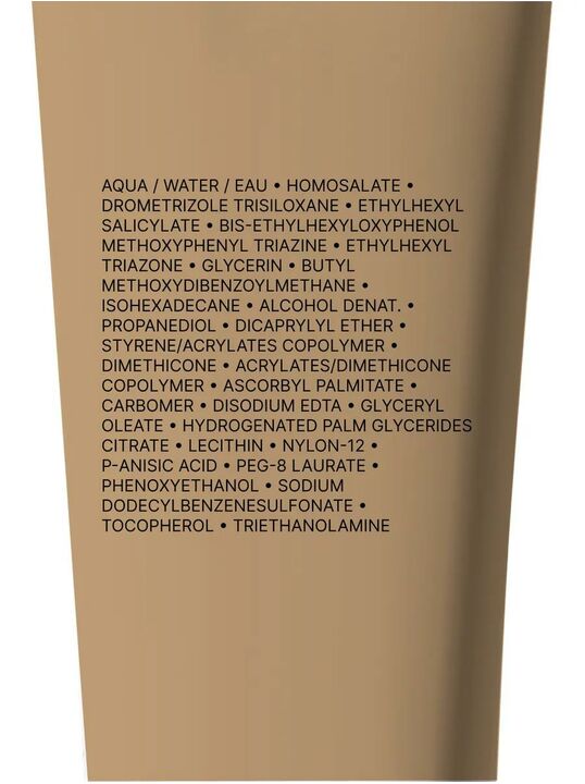 AQUA / WATER • HOMOSALATE • DROMETRIZOLE TRISILOXANE • ETHYLHEXYL SALICYLATE • BIS-ETHYLHEXYLOXYPHENOL METHOXYPHENYL TRIAZINE • ETHYLHEXYL TRIAZONE • GLYCERIN • BUTYL METHOXYDIBENZOYLMETHANE • ISOHEXADECANE • ALCOHOL DENAT. • PROPANEDIOL • DICAPRYLYL ETHER • STYRENE/ACRYLATES COPOLYMER • DIMETHICONE • ACRYLATES/DIMETHICONE COPOLYMER • p-ANISIC ACID • ASCORBYL PALMITATE • CARBOMER • DISODIUM EDTA • GLYCERYL OLEATE • HYDROGENATED PALM GLYCERIDES CITRATE • LECITHIN • NYLON-12 • PEG-8 LAURATE • PHENOXYETHANOL • TOCOPHEROL • TRIETHANOLAMINE