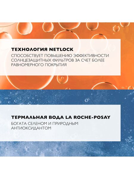 Увлажняющая текстура, нежирная, нелипкая, устойчивая к воде и поту. Не оставляет белых следов. Доказанная эффективность: Очень высокая степень защиты от UVA- и UVB-лучей. Технология NETLOCK способствует повышению эффективности солнцезащитных фильтров за счет более равномерного покрытия. Содержит термальную воду La Roche-Posay, богатую селеном, природным антиоксидантом.