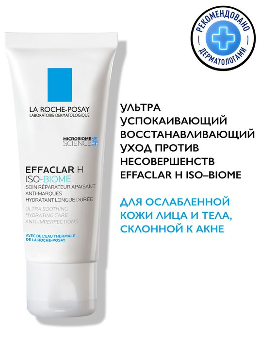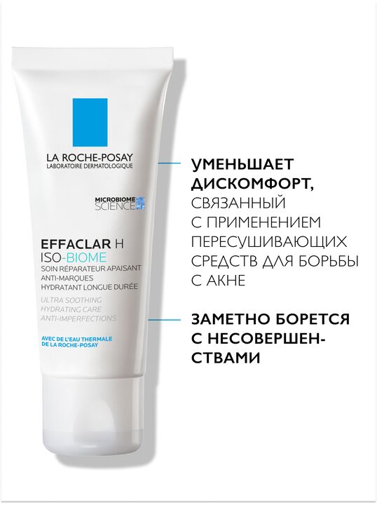 Кожа, склонная к появлению жирного блеска и несовершенств нуждается в увлажнении и защите не меньше, чем кожа любого другого типа. Использование средств для борьбы с акне может приводить к нарушению естественного защитного барьера кожи, ощущению сухости и дискомфорта. Ультра* Успокаивающий восстанавливающий уход Effaclar H Iso-Biome не только увлажняет кожу, возвращая ощущение комфорта, но и борется с несовершенствами.