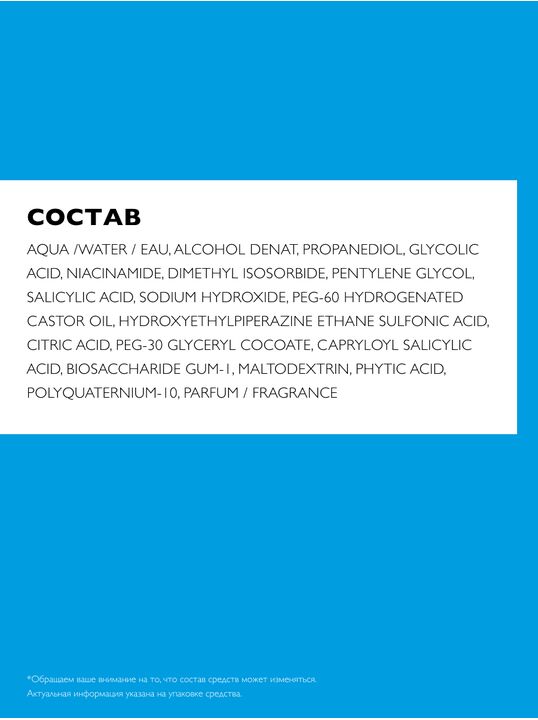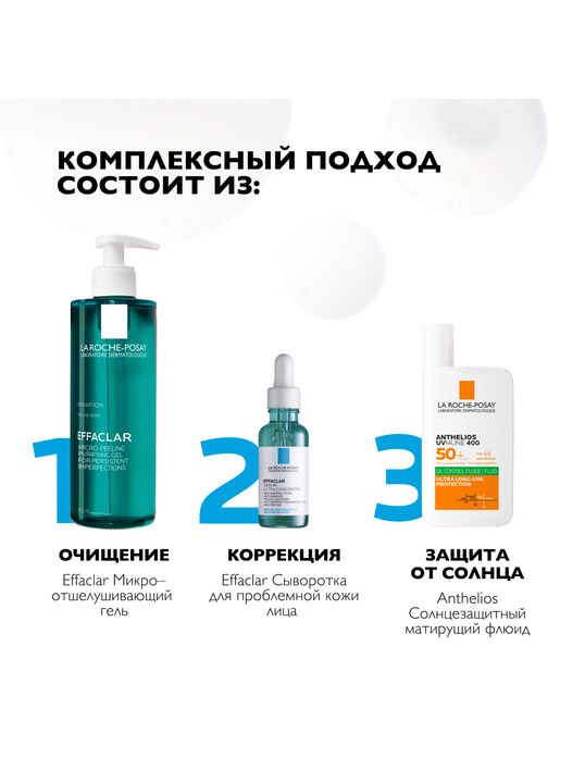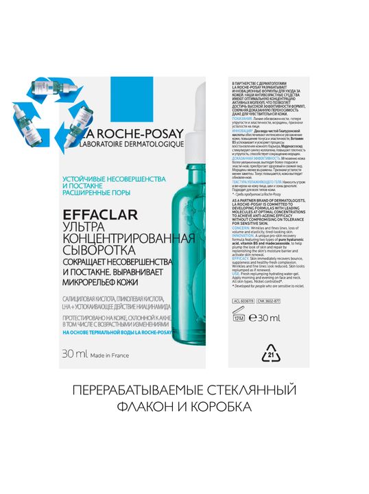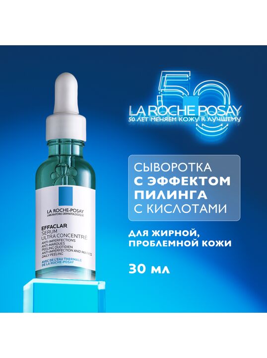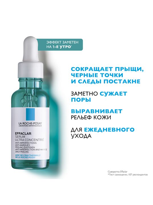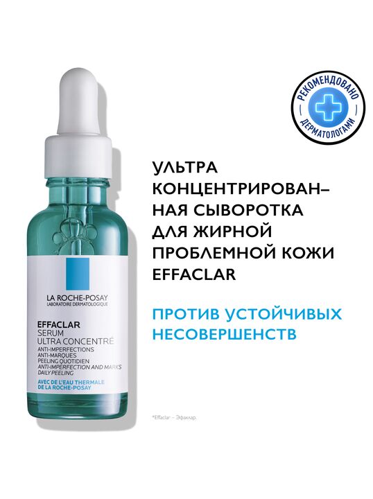 Ультра Концентрированная Сыворотка Effaclar содержит интенсивный комплекс из Салициловой, Гликолевой и Липо-Гидрокси-Кислоты, дополняющих действие друг друга для оптимальной эффективности в борьбе против несовершенств, черных точек и следов постакне. День за днем сыворотка ощутимо обновляет кожу, заметно улучшая микрорельеф кожи и тон лица, а также предотвращая повторного появления следов постакне. Ниацинамид и Термальная Вода La Roche-Posay в составе средства успокаивают кожу.