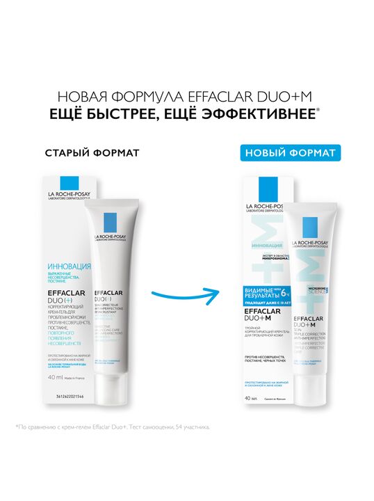 Реновация: LA ROCHE-POSAY EFFACLAR DUO+ M Тройной корректирующий крем-гель сокращает выраженные несовершенства, черные точки и постакне. Препятствует повторному образованию несовершенств и предупреждает появление остаточных следов от несовершенств в виде красных и темных пятен. Устраняет жирный блеск и увлажняет кожу. Крем-гель можно использовать как базу под макияж. Видимый результат уже через 6 часов*. Подходит даже с 10 лет.