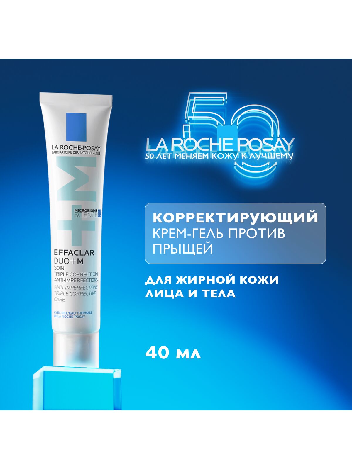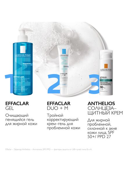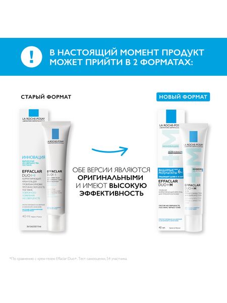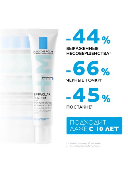Реновация: LA ROCHE-POSAY EFFACLAR DUO+ M Тройной корректирующий крем-гель сокращает выраженные несовершенства, черные точки и постакне. Препятствует повторному образованию несовершенств и предупреждает появление остаточных следов от несовершенств в виде красных и темных пятен. Устраняет жирный блеск и увлажняет кожу. Крем-гель можно использовать как базу под макияж. Видимый результат уже через 6 часов*. Подходит даже с 10 лет.