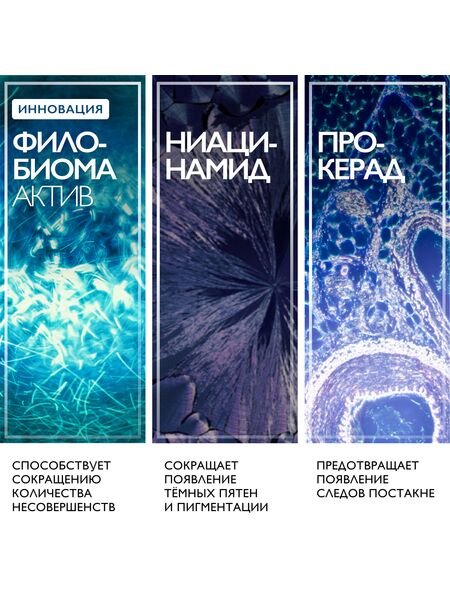 Инновация: Новый активный ингредиент Филобиома Aктив целенаправленно воздействует именно на филотип IA1, способствующий появлению акне. Сокращает несовершенства, устраняет избыток кожного сала и успокаивает кожу. Воздействует на 4 параметра несовершенств (диаметр, рельеф, качество кожи и покраснения, вызванные несовершенствами).