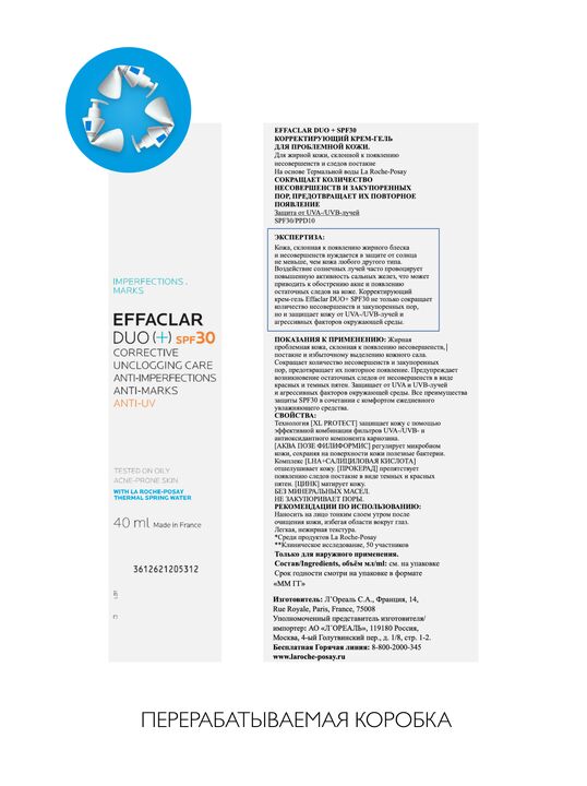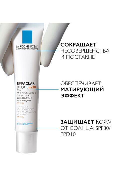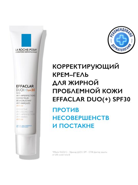 Кожа, склонная к появлению жирного блеска и несовершенств нуждается в защите от солнца не меньше, чем кожа любого другого типа. Воздействие солнечных лучей часто провоцирует повышенную активность сальных желез, что может приводить к обострению акне и появлению остаточных следов на коже. Корректирующий крем-гель Effaclar DUO+ SPF30 не только сокращает количество несовершенств и закупоренных пор, но и защищает кожу от UVA-/UVB-лучей и агрессивных факторов окружающей среды. Протестировано в загрязненной окружающей среде (Индекс Качества Воздуха - 120)***