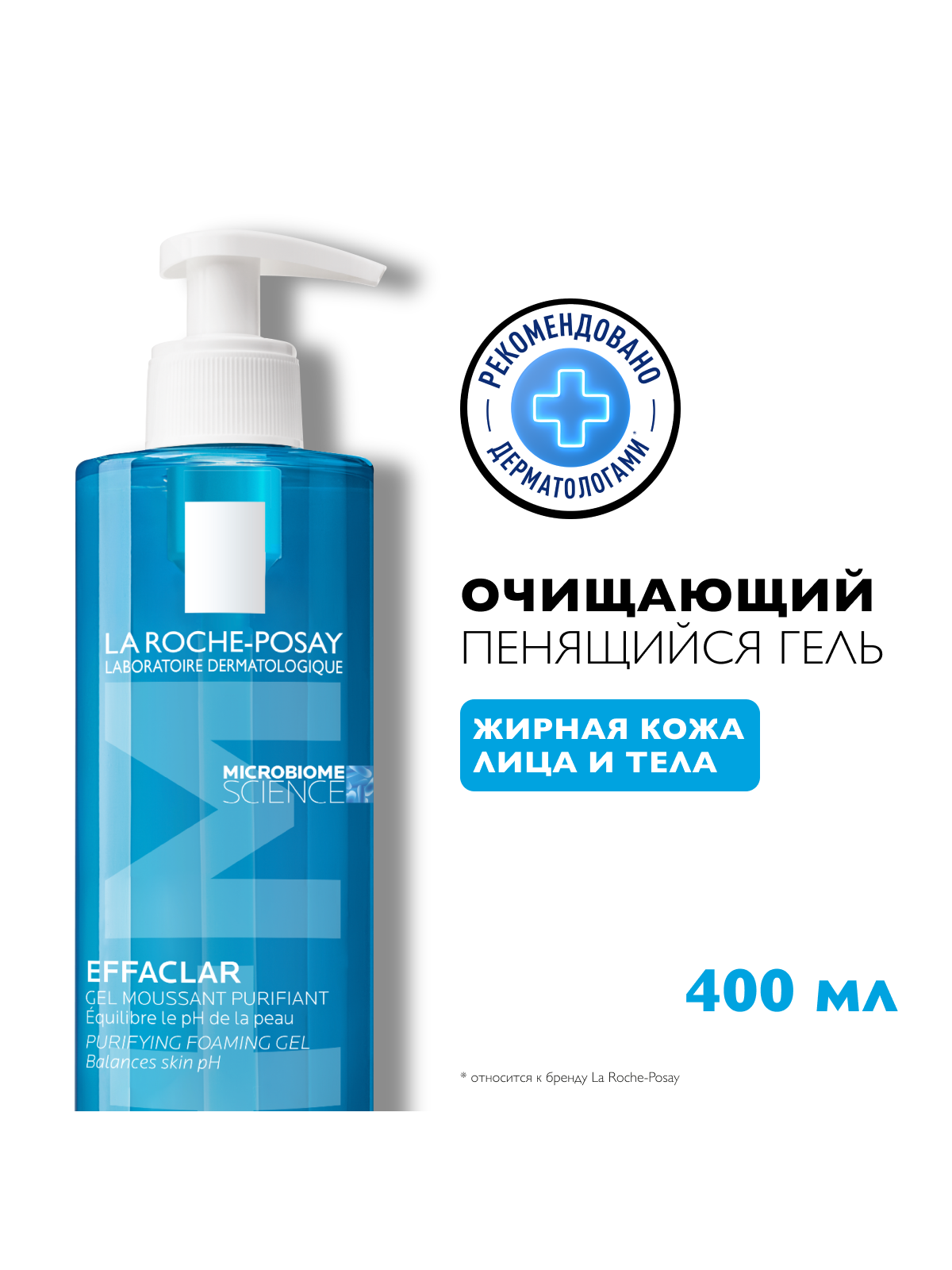 - LA ROCHE-POSAY EFFACLAR Гель очищающий пенящийся для чувствительной жирной кожи лица и тела, 400 мл. Реновация LA ROCHE-POSAY EFFACLAR: Пенящийся гель бережно очищает поры благодаря комплексу компонентов, мягко воздействующих на жирную чувствительную кожу. Эффективно удаляет загрязнения и кожное сало, делая кожу чистой и свежей. Благодаря специальной технологии поддерживает оптимальный рН. Формула геля содержит термальную воду LA ROCHE-POSAY. Используйте его регулярно, чтобы повысить эффективность ухода за проблемной кожей.