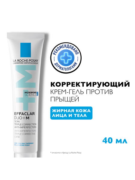Реновация: LA ROCHE-POSAY EFFACLAR DUO+ M Тройной корректирующий крем-гель сокращает выраженные несовершенства, черные точки и постакне. Препятствует повторному образованию несовершенств и предупреждает появление остаточных следов от несовершенств в виде красных и темных пятен. Устраняет жирный блеск и увлажняет кожу. Крем-гель можно использовать как базу под макияж. Видимый результат уже через 6 часов*. Подходит даже с 10 лет.