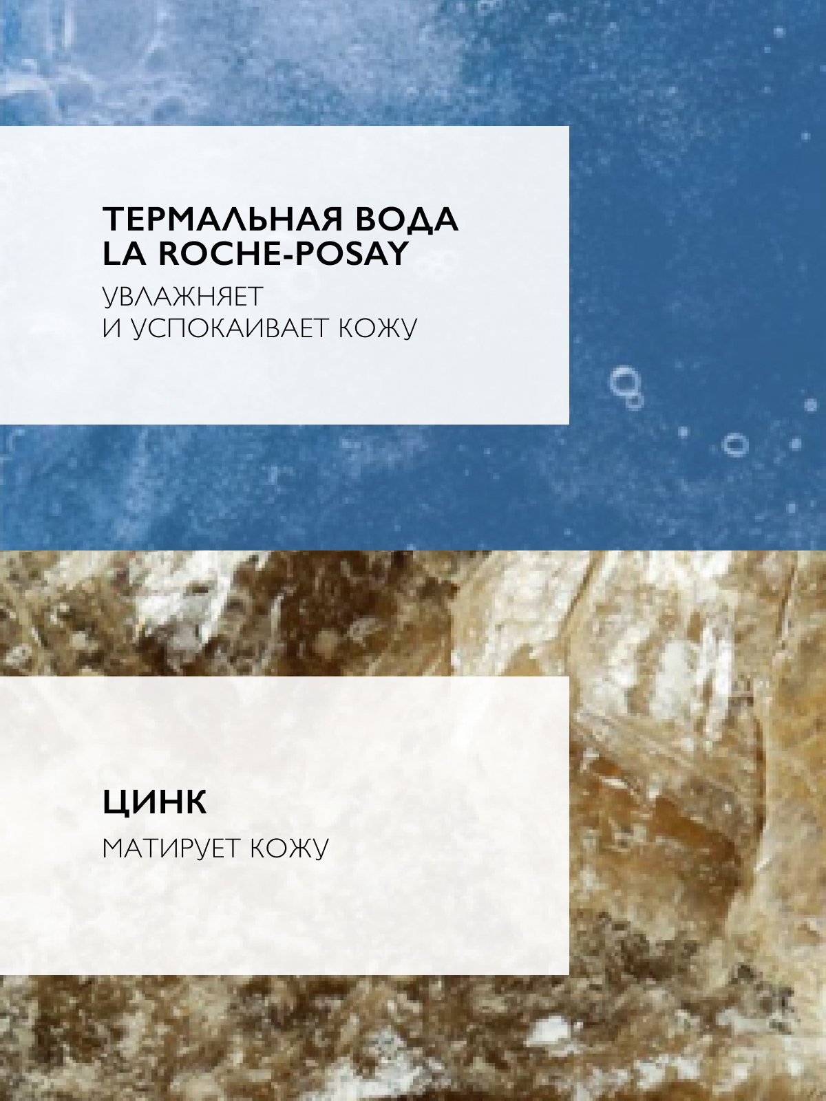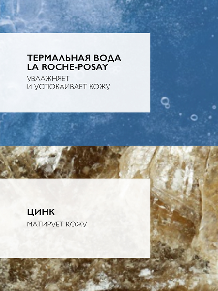 ТЕРМАЛЬНАЯ ВОДА LA ROCHE-POSAY – cмягчает, увлажняет, успокаивает кожу. Обладает антиоксидантным эффектом. КОКО-БЕТАИН – поверхностно-активное вещество, вырабатываемое из жирных кислот кокосового масла, мягко очищает кожу. ЦИНК – матирует кожу.