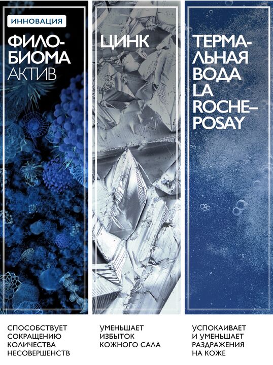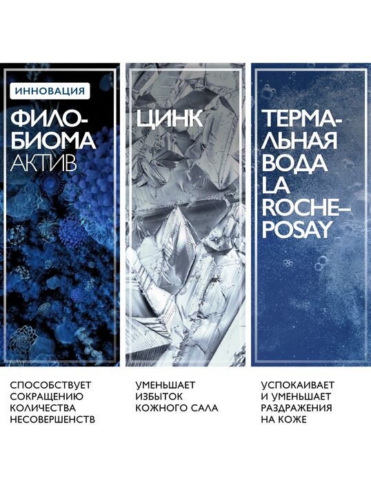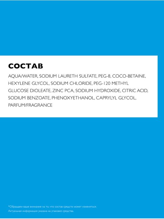 ТЕРМАЛЬНАЯ ВОДА LA ROCHE-POSAY – cмягчает, увлажняет, успокаивает кожу. Обладает антиоксидантным эффектом. КОКО-БЕТАИН – поверхностно-активное вещество, вырабатываемое из жирных кислот кокосового масла, мягко очищает кожу. ЦИНК – матирует кожу.