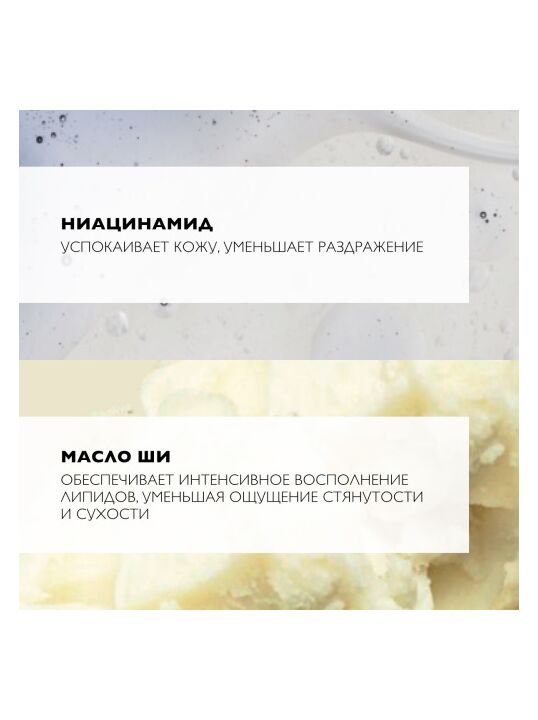 Масло Карите / SHEA BUTTER – имеет сродство со структурой кожи и обеспечивает естественное восполнение гидролипидной мантии на поверхности эпидермиса, интенсивно увлажняет, смягчает, снимает раздражение. Ниацинамид / NIACINAMIDE – снимает зуд, предупреждает снижение защитных свойств кожи, препятствует проникновению бактериальных агентов. Обладает противовоспалительным действием.