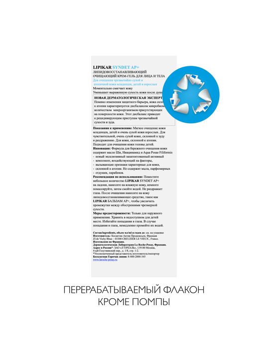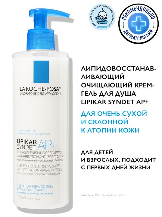 Липидовосстанавливающий очищающий крем-гель для лица и тела младенцев детей и взрослых LIPIKAR SYNDET AP+ мягко очищает кожу младенцев, детей и очень сухую кожу взрослых. Моментально смягчает кожу и уменьшает выраженную сухость кожи после душа.