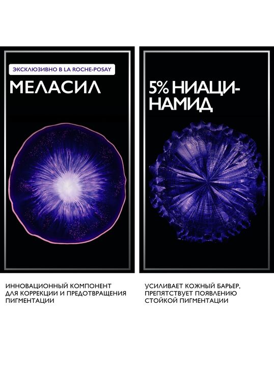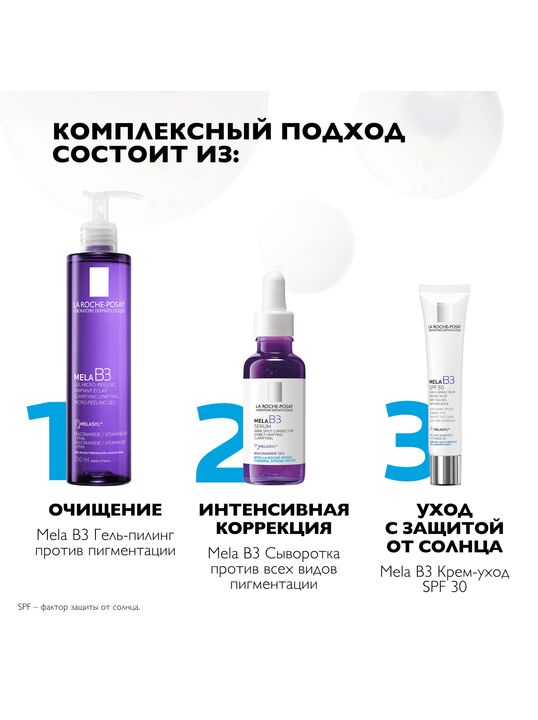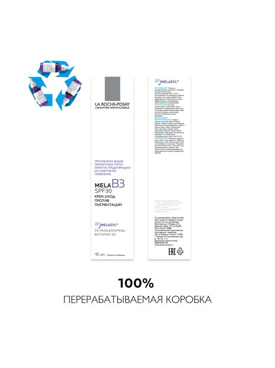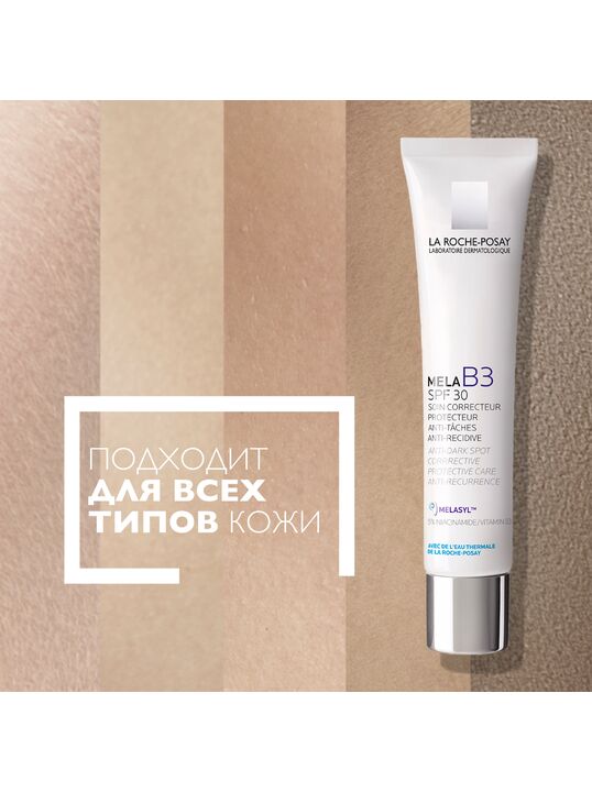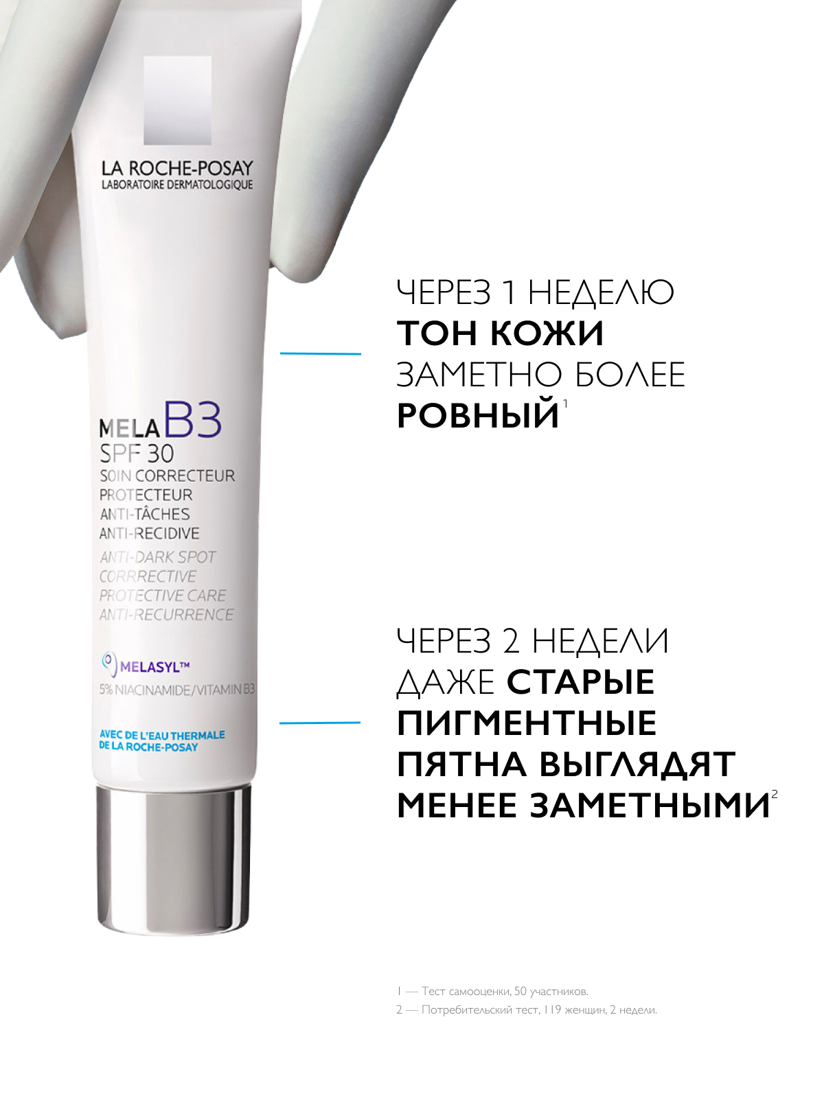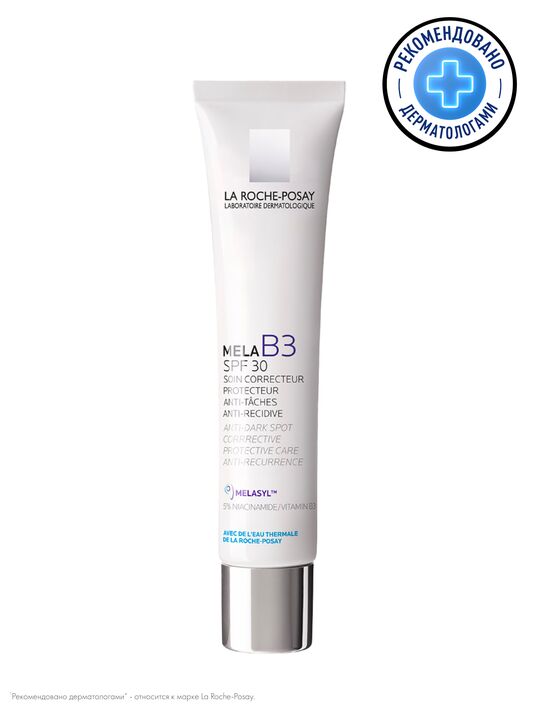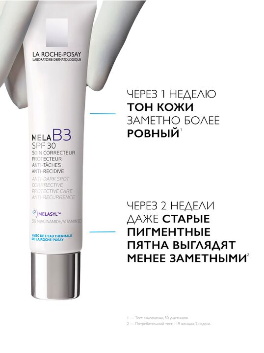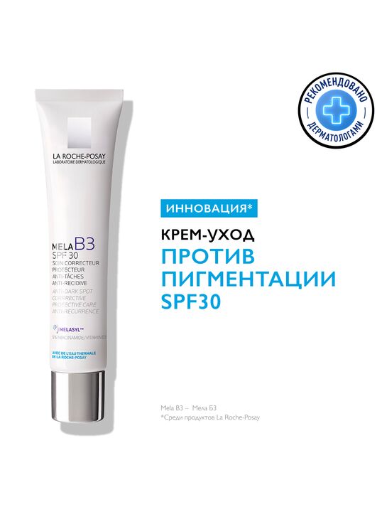LA ROCHE-POSAY MELA B3 крем-уход против пигментации SPF 30 борется со всеми видами пигментных пятен и предотвращает их повторное появление. ИННОВАЦИЯ*: Меласил – инновационный компонент в борьбе против пигментации, запатентованный после 18 лет исследований. Он блокирует избыток меланина еще до того, как пигментация может проявиться на коже. Эффективность подтверждена клиническими исследованиями. ПОКАЗАНИЯ: Все виды пигментации, в том числе и пост-акне. ДОКАЗАННАЯ ЭФФЕКТИВНОСТЬ: Через 1 неделю** тон кожи заметно более ровный. Через 2 недели** количество и интенсивность пигментных пятен значительно уменьшены. Через 1 месяц*** применения даже стойкие пигментные пятна заметно уменьшены. Препятствует повторному появлению пигментации. * Среди продуктов La Roche-Posay. ** Потребительский тест, 50 участников *** Клиническая оценка, 41 участников.