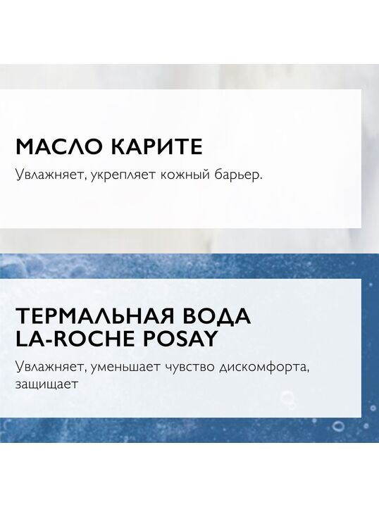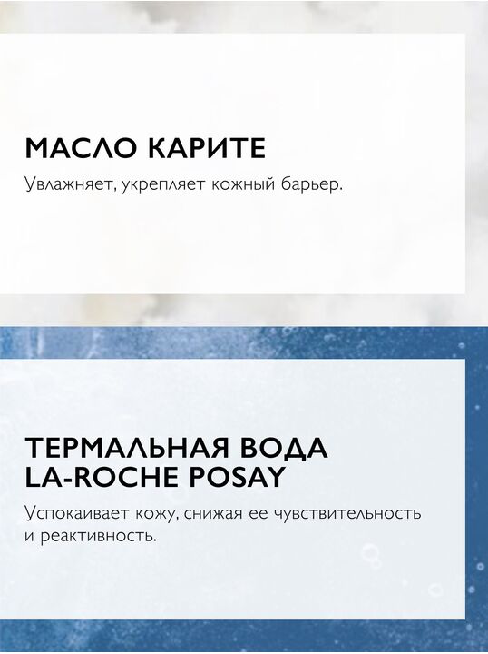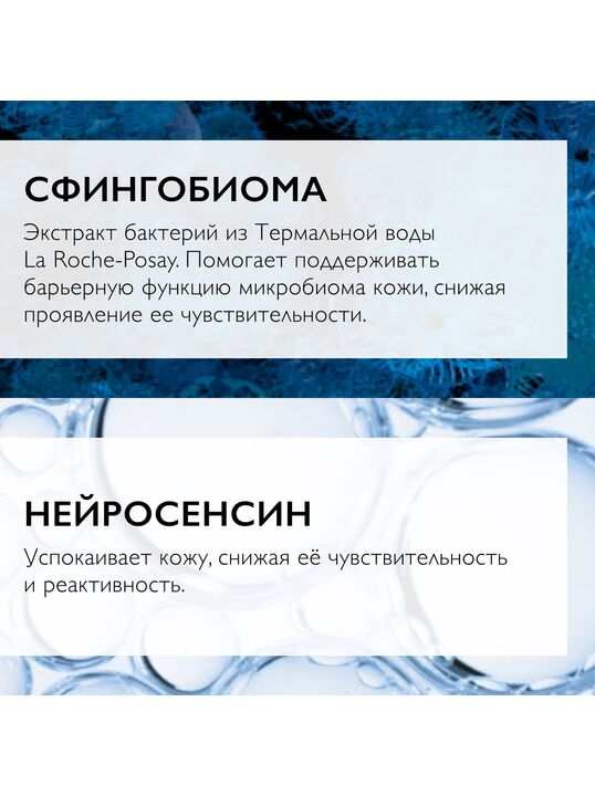 Особенности состава: 2% Сфингобиома (экстракт пробиотика) успокаивает кожу, восстанавливает функцию микробиома кожи., Нейросенсин успокаивает кожу, уменьшает реактивность., Масло карите укрепляет кожный барьер, увлажняет. , Термальная вода La Roche-Posay успокаивает, увлажняет, уменьшает чувство дискомфорта