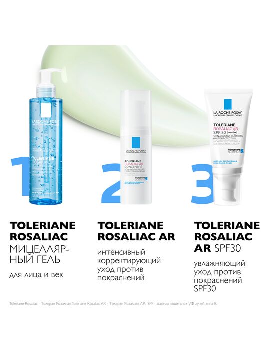 СПОСОБ ПРИМЕНЕНИЯ: Наносить утром и вечером после очищения кожи мицеллярным гелем TOLERIANE ROSALIAC. Утром после использования интенсивного ухода Toleriane Rosaliac AR рекомендуется применять уход Toleriane Rosaliac AR SPF30.
