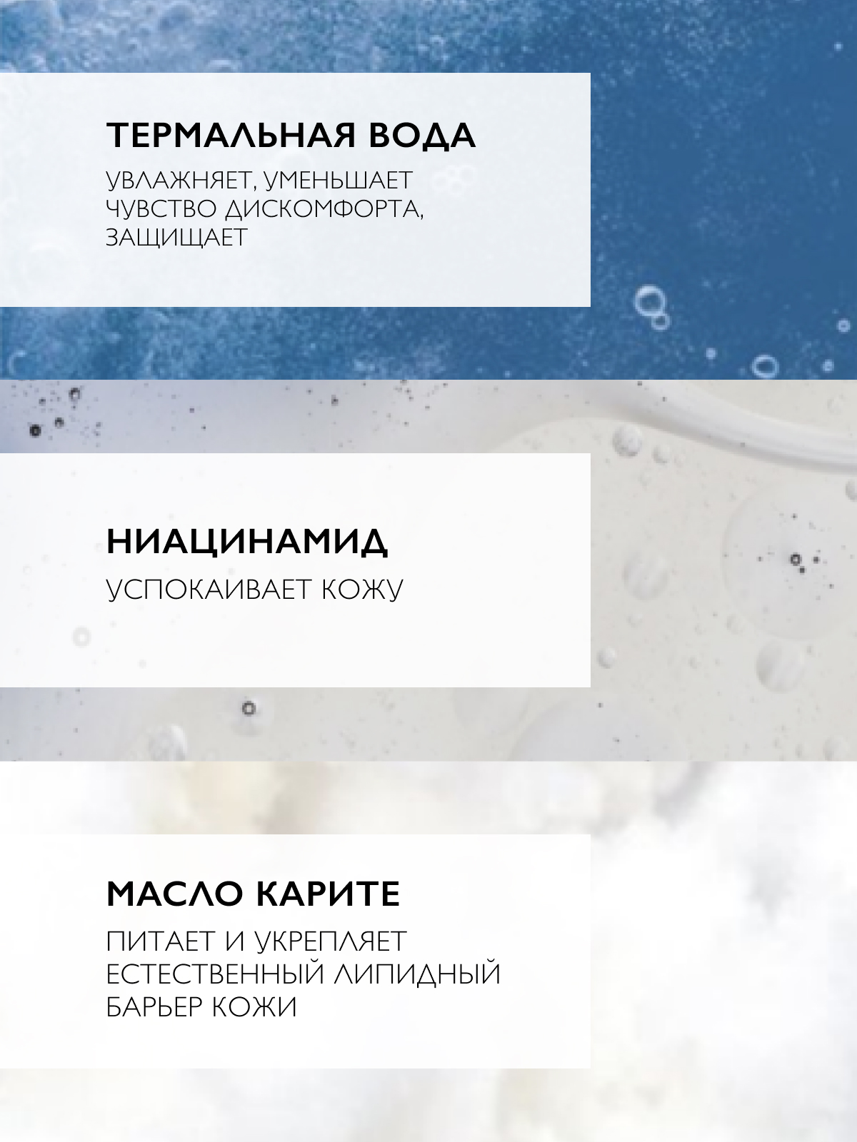 ТЕРМАЛЬНАЯ ВОДА LA ROCHE-POSAY В КОНЦЕНТРАЦИИ 74%/AQUA - уменьшает чувство дискомфорта, защищает, увлажняет; ГЛИЦЕРИН РАСТИТЕЛЬНОГО ПРОИСХОЖДЕНИЯ/GLYCERIN - интенсивно увлажняет кожу; НИАЦИНАМИД/NIACINAMIDE - успокивает кожу; ЦЕРАМИД/CERAMIDE NP - укрепляет естественный защитный барьер кожи.