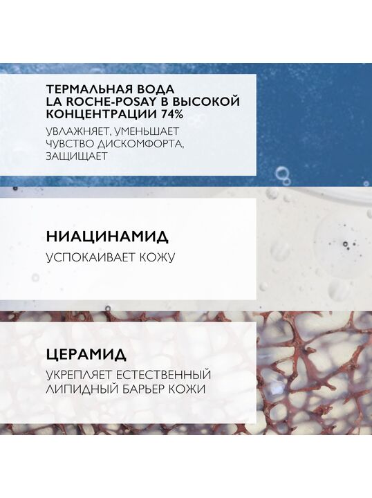 - [Термальная вода La Roche-Posay в высокой концентрации 74%] - увлажняет, уменьшает чувство дискомфорта, защищает.