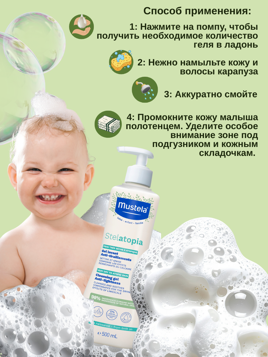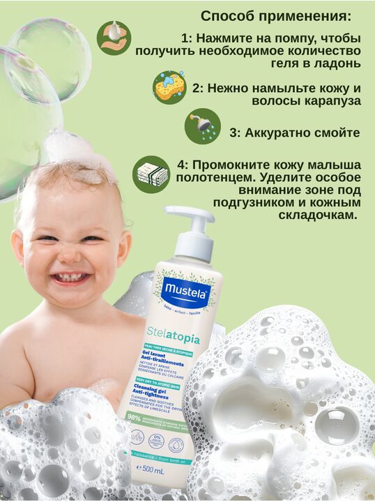 Нанесите средство на влажные лицо и тело малыша, помассируйте, затем тщательно смойте большим количеством воды. После бережного вытирания продолжите уход, используя бальзам или крем Stelatopia для дополнительной защиты.