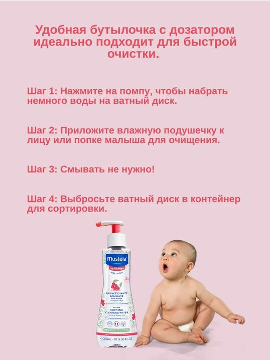 Очищающая вода Mustela No Rinse Soothing Cleansing Water 300 мл — это мягкая мицеллярная вода без отдушек, разработанная для младенцев и детей с очень чувствительной кожей. Она эффективно очищает лицо, тело и область под подгузником без смывания, оставляя кожу мягкой, успокаивающей и свежей.