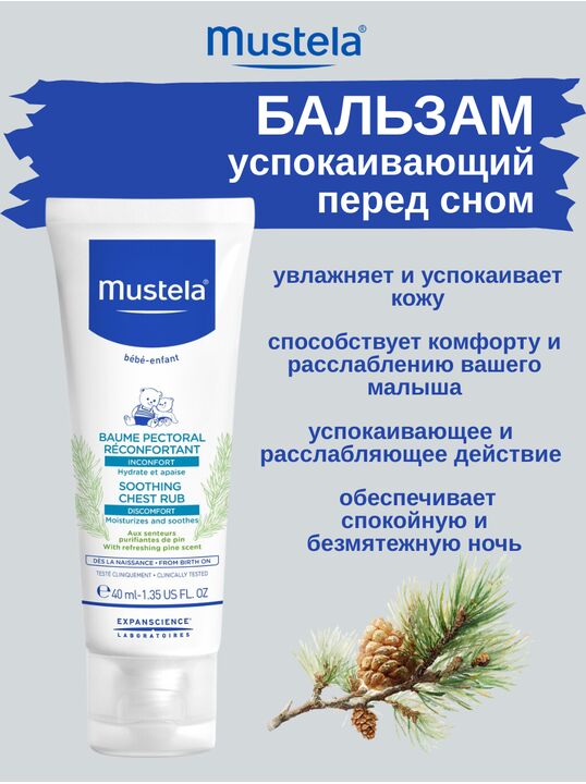 Успокаивающий бальзам для груди Mustela 40 мл – это мягкий, успокаивающий бальзам, обогащенный экстрактами сосны, розмарина и эвкалипта, способствующий расслаблению и хорошему самочувствию. Специально разработанный для младенцев и детей с рождения , он увлажняет нежную кожу и обеспечивает успокаивающий массаж, особенно в прохладное время года.