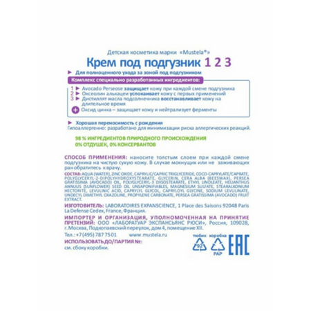 Крем под подгузник 1 2 3 от Mustela® создан специально для борьбы с факторами, вызывающими раздражение и покраснение кожи в зоне под подгузником. Разработан с учетом особенностей кожи новорождённых, безопасен для использования с первого дня жизни. Формула разработана для минимизации риска аллергических реакций.