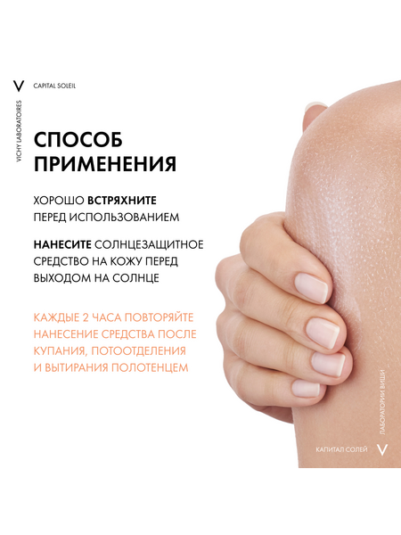Наносите средство непосредственно перед выходом на солнце. Обильно и часто повторяйте нанесение средства, особенно после купания или вытирания. Избегайте области вокруг глаз. В случае попадания средства в глаза тщательно промойте их водой. Избегайте контакта с одеждой.