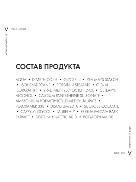 AQUA, DIMETHICONE, GLYCERIN, ZEAMAYSSTARCH, ISOHEXADECANE, SORBITANTEARATE, C1 3-1 4 ISOPARAFFIN 2, DIMETHYL - 7 - OCTEN - 2 - OL, STEARYL ALCOHOL, CALCIUM PANTETHEINE SULFONATE, AMMONIUM POLYACRYLDIMETHYLTAURAMIDE, POLOXAMER 338, DISODIUMEDTA, SUCROSE COCOATE, CAPRYLYL GLYCOL, LAURETH-7, EPERUA FALCATA BARK EXTRACT, DEXTRIN, LACTIC ACID, POLYACRYLAMIDE.