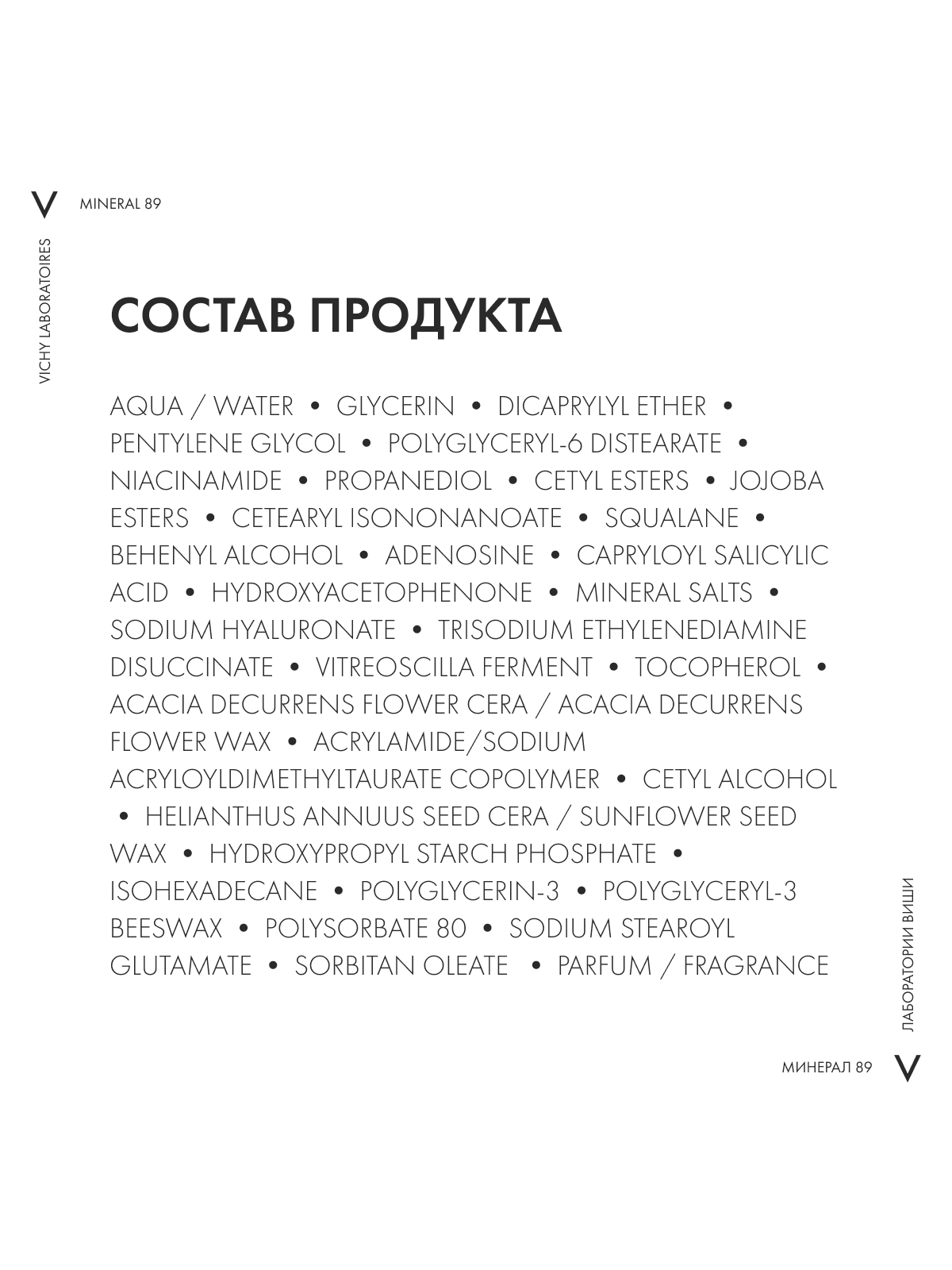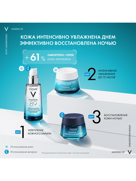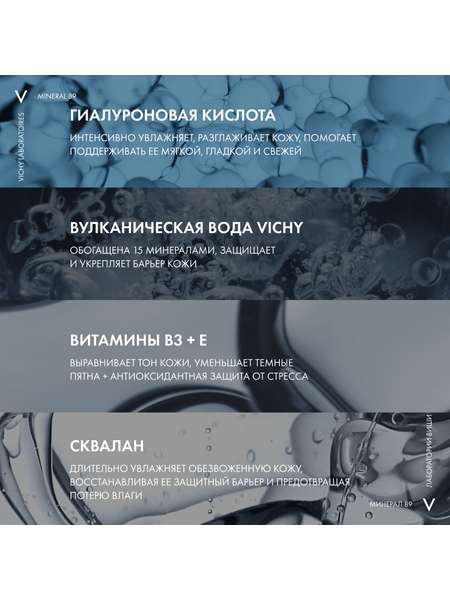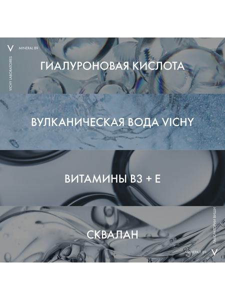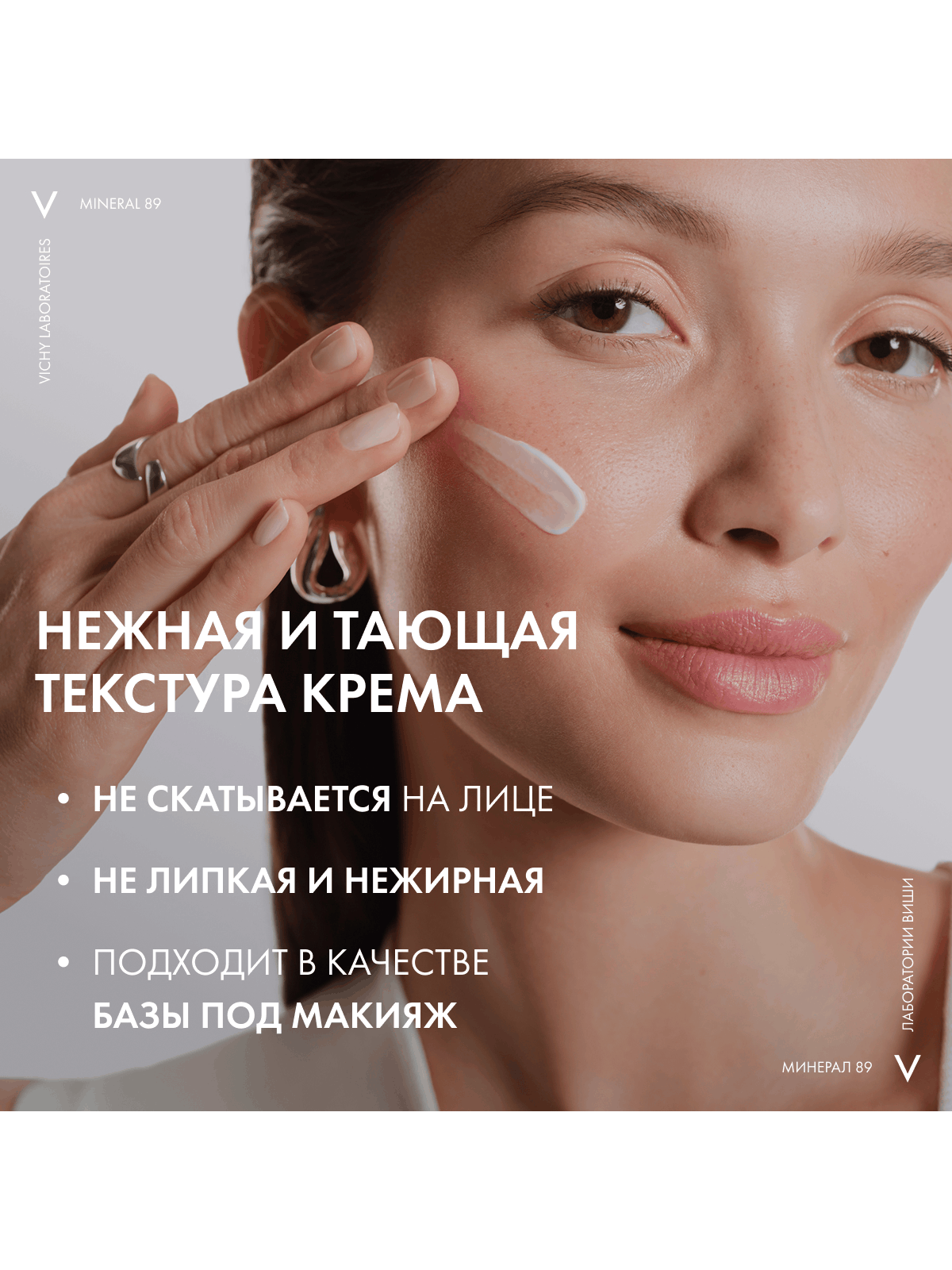 Насыщенный крем Mineral 89 с высокой концентрацией липидов природного происхождения восстанавливает защитный барьер, обеспечивает длительное увлажнение до 72 часов. Выравнивает тон кожи и придает ей сияние. Формула протестирована под контролем дерматологов. Подходит для чувствительной кожи. Содержит чистую гиалуроновую кислоту, витамины B3 + E, сквалан, липиды и вулканическую воду Vichy.