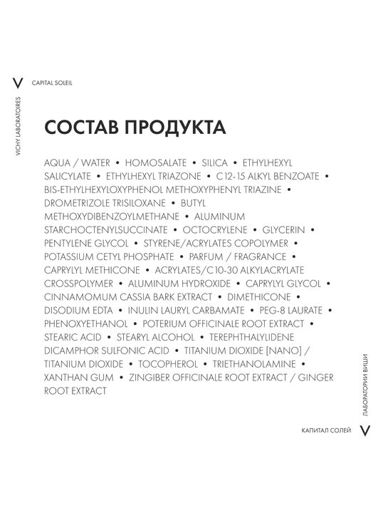 UVB [Eusolex HMS**, ETHYLHEXYL SALICYLATE**, OCTOCRYLENE, Uvinul T150, Titanium Dioxide], UVA [Tinosorb S, Parsol® 1789, Mexoryl® SX], Витамин Е, гиалуроновая кислота*, экстракт коры Кассии**, экстракт корня POTERIUM OFFICINALE**, экстракт корня имбиря**, Термальная вода VICHY SPA.
