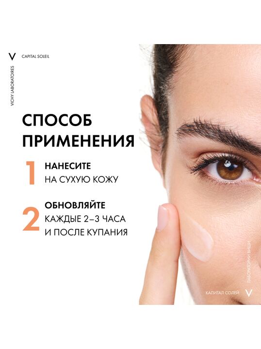 Наносить на сухую кожу. Обновлять каждые 2–3 часа и после купания.
