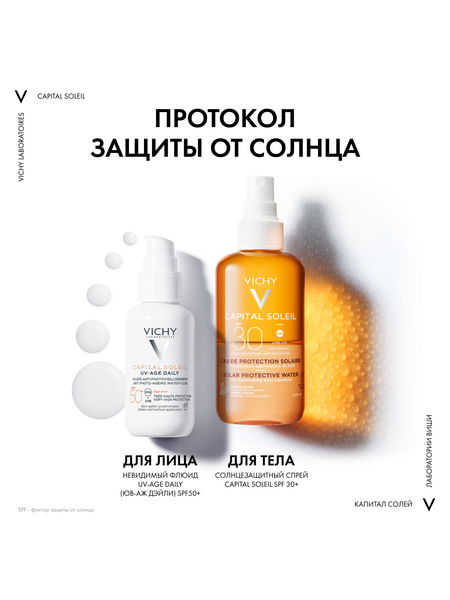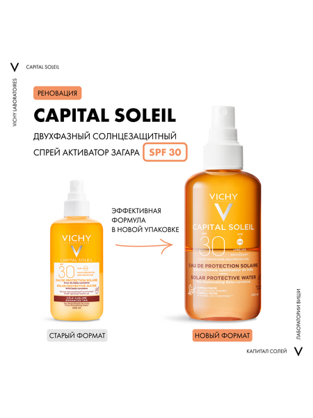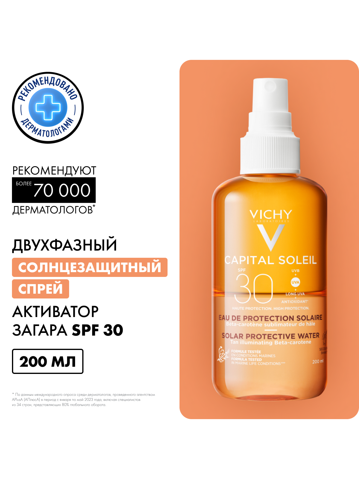 Высокая защита UVB + UVA в инновационной текстуре воды. Лёгкая двухфазная формула с [БЕТА-КАРОТИНОМ] и [МИНЕРАЛИЗИРУЮЩЕЙ ТЕРМАЛЬНОЙ ВОДОЙ VICHY] способствует приобретению заметно более интенсивного равномерного натурального загара. Оставляет на коже легкий сатиновый бархатистый финиш. Не содержит автозагара.