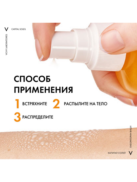 Наносите солнцезащитное средство на кожу непосредственно перед выходом на солнце. Не распыляйте средство непосредственно на лицо, нанесите на ладони ираспределите по коже лица, избегая зоны вокруг глаз. При попадании средства в глаза немедленно и тщательно промойте их водой. Для поддержания защиты регулярно и в достаточном количестве повторяйте нанесение средства, особенно после купания, интенсивного потоотделения и вытирания полотенцем.
