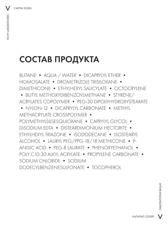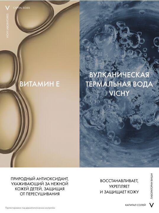 Система солнцезащитный фильтров Mexoryl SX + Mexoryl XL; Витамин Е; Минерализующая термальная вода Vichy.