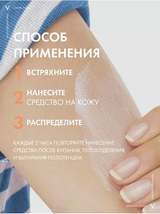 Хорошо встряхните перед использованием, пока не услышите звук шарика внутри баллона. Наносите солнцезащитное средство на кожу непосредственно перед выходом на солнце. При нанесении избегайте зоны вокруг глаз. При попадании средства в глаза немедленно и тщательно промойте их водой. Для поддержания защиты регулярно и в достаточном количестве повторяйте нанесение средства, особенно после купания, интенсивного потоотделения и вытирания полотенцем.