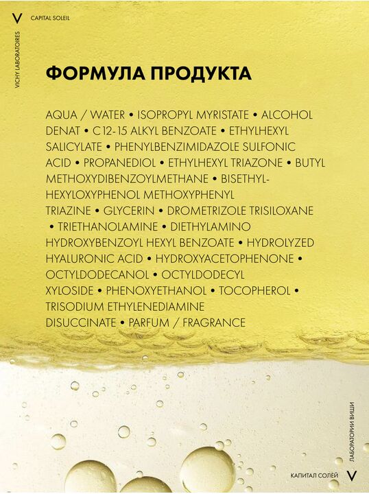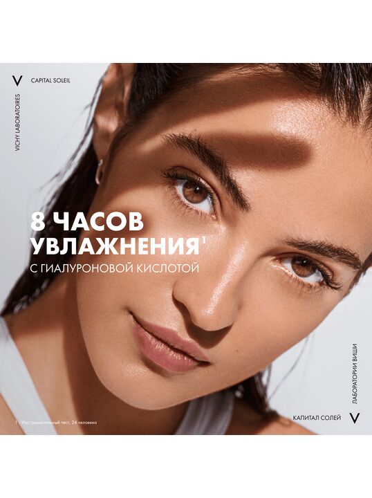 Средство с высокой защитой от UVA-и UVB-лучей в инновационной* текстуре воды. Лёгкая двухфазная формула с [Гиалуроновой кислотой] и [Минерализируюшей термальной водой Vichy] укрепляет защитный барьер кожи и обеспечивает 8 часов интенсивного увлажнения**, оставляя на коже легкий бархатистый финиш. Легко наносится и быстро впитывается. Обладает нелипкой текстурой. Подходит для всех типов кожи, даже для чувствительной. Гипоаллергенно. Протестировано под контролем дерматологов.