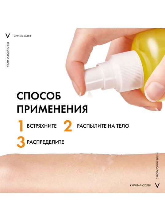 Наносите солнцезащитное средство на кожу непосредственно перед выходом на солнце. Не распыляйте средство непосредственно на лицо, нанесите на ладони и распределите по коже лица, избегая зоны вокруг глаз. При попадании средства в глаза немедленно и тщательно промойте их водой. Для поддержания защиты регулярно и в достаточном количестве повторяйте нанесение средства, особенно после купания, интенсивного потоотделения и вытирания полотенцем. Используйте солнцезащитные продукты, дающие достаточную защиту Вашей коже. Избегайте нахождения на солнце в период его максимальной активности.