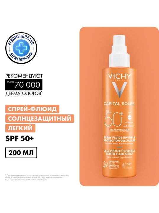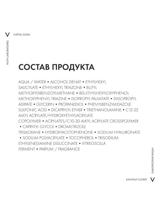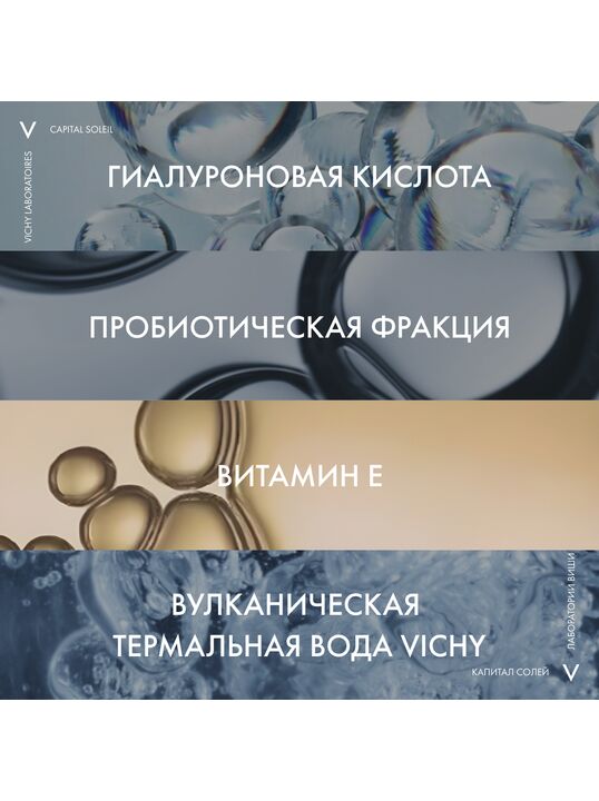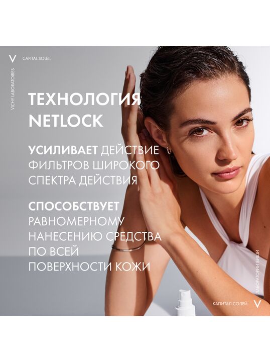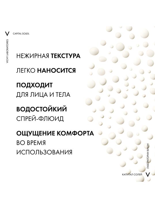 Ультралегкий невидимый спрей-флюид обеспечивает очень высокую степень защиты от УФ-излучения – типов UVB, UVA, в том числе, длинного UVA . Запатентованная [ТЕХНОЛОГИЯ NETLOCK] усиливает действие фильтров широкого спектра действия и способствует равномерному нанесению средства по всей поверхности кожи. Нежирная текстура средства обеспечивает легкое нанесение и ощущение комфорта во время использования. Формула с [ФРАКЦИЕЙ ПРОБИОТИКА И ГИАЛУРОНОЙ КИСЛОТОЙ] защищает кожу от пересушивания на солнце, а также при контакте с морской водой . [ВУЛКАНИЧЕСКАЯ ТЕРМАЛЬНАЯ ВОДА VICHY], обладающая восстанавливающими и укрепляющими свойствами, усиливает защитный барьер кожи. Протестировано под контролем дерматологов и офтальмологов. Гипоаллергенно.
