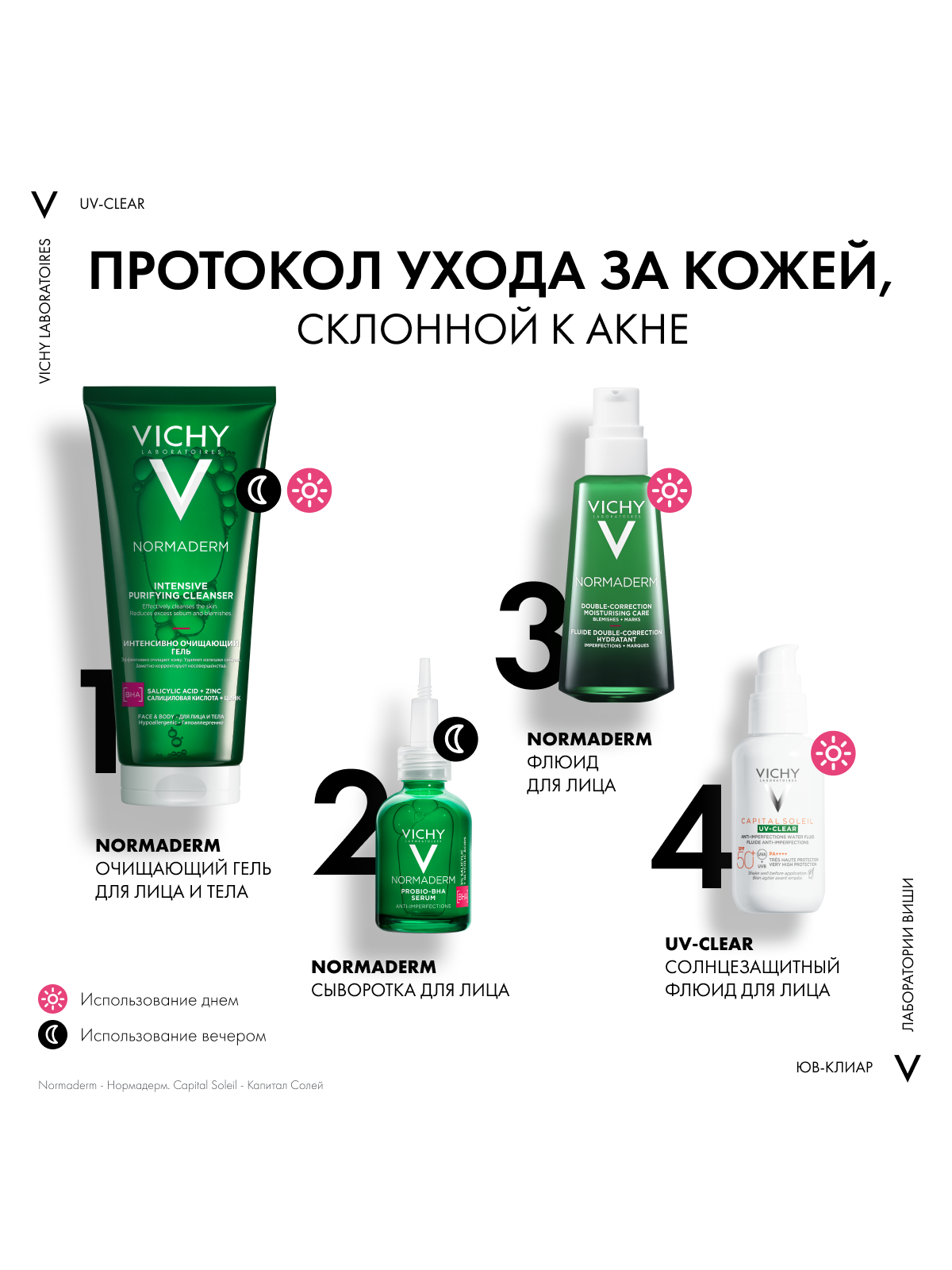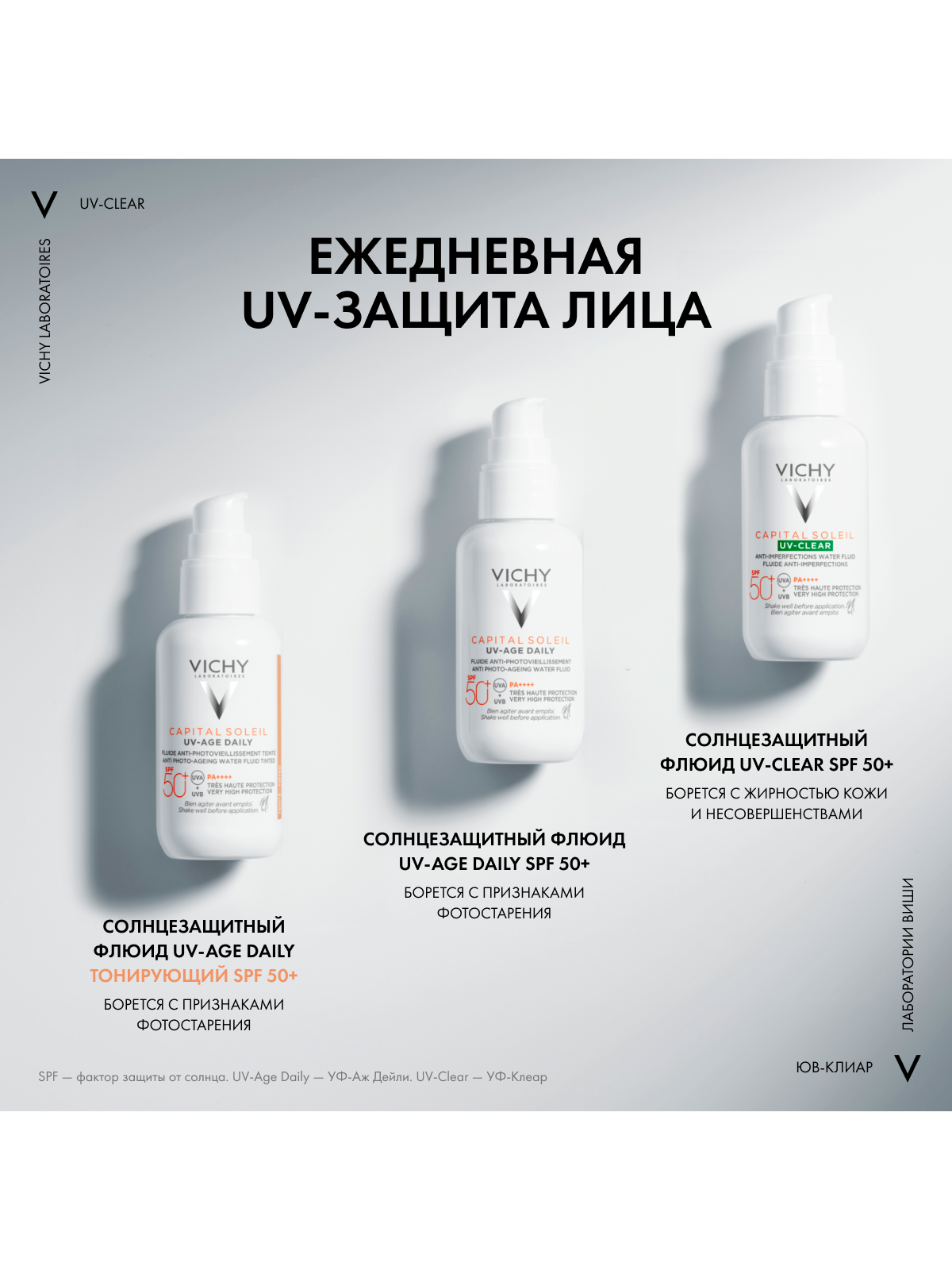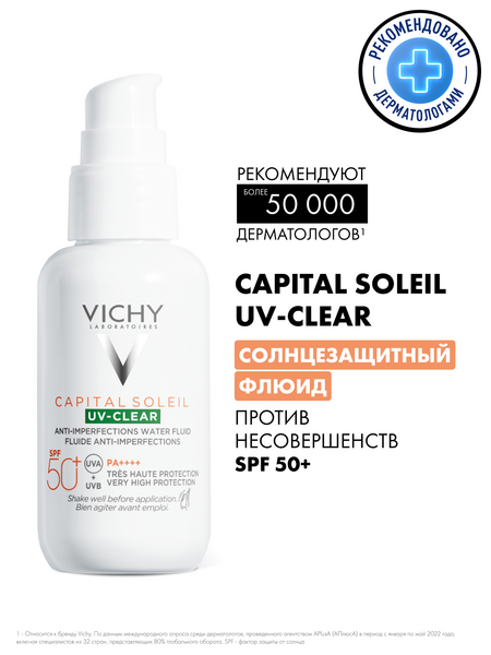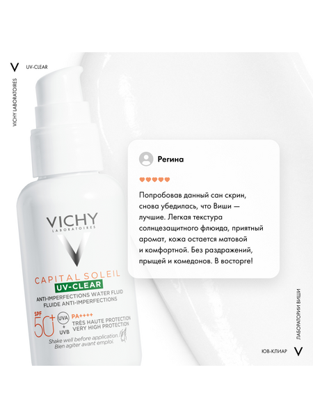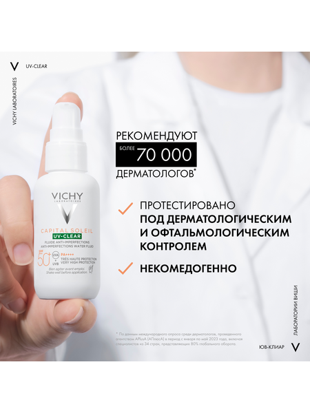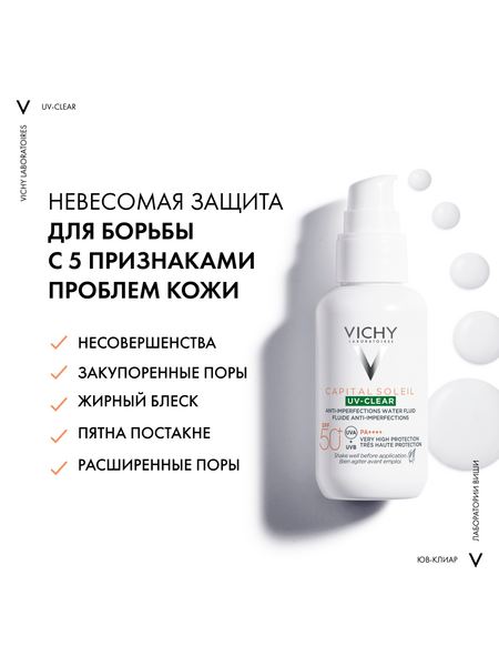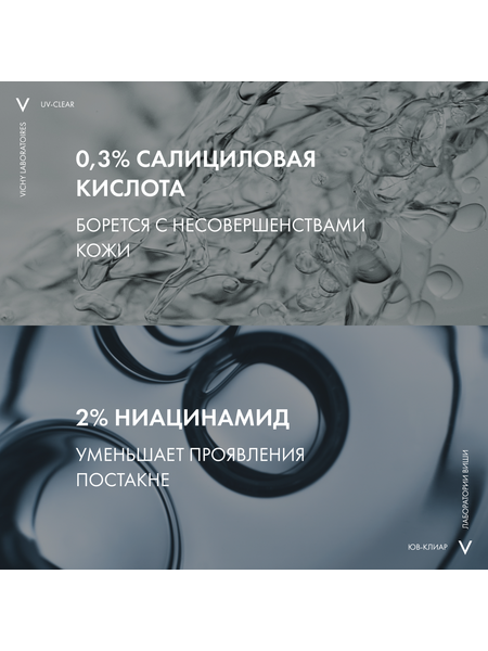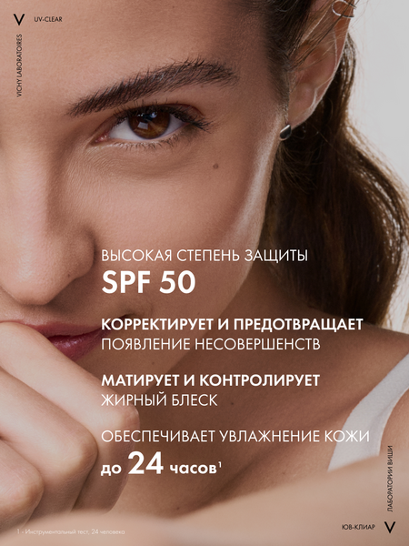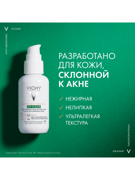 UV-излучение провоцирует формирование несовершенств на коже, склонной к акне. Поэтому важно ежедневно защищать кожу от воздействия UV -лучей. Виши представляет инновацию - невесомый солнцезащитный флюид для лица с очень высокой степенью защиты для кожи, склонной к акне. Эффективная формула с салициловой кислотой и ниацинамидом на основе вулканической воды Виши разработана специально для жирной и проблемной кожи. Флюид не только обеспечиваю высокую степень защиты от UV-A+UV-B лучей, но и корректирует и предотвращаем появление несовершенств, связанных с воздействием UV-лучей, и моментально матирует и контролирует жирный блеск, при этом обеспечивая увлажнение кожи до 24 часов. Запатентованная технология Netlock усиливает действие защитных фильтров широкого спектра и гарантирует невесомую и невидимую защиту без жирного блеска и следов на коже.