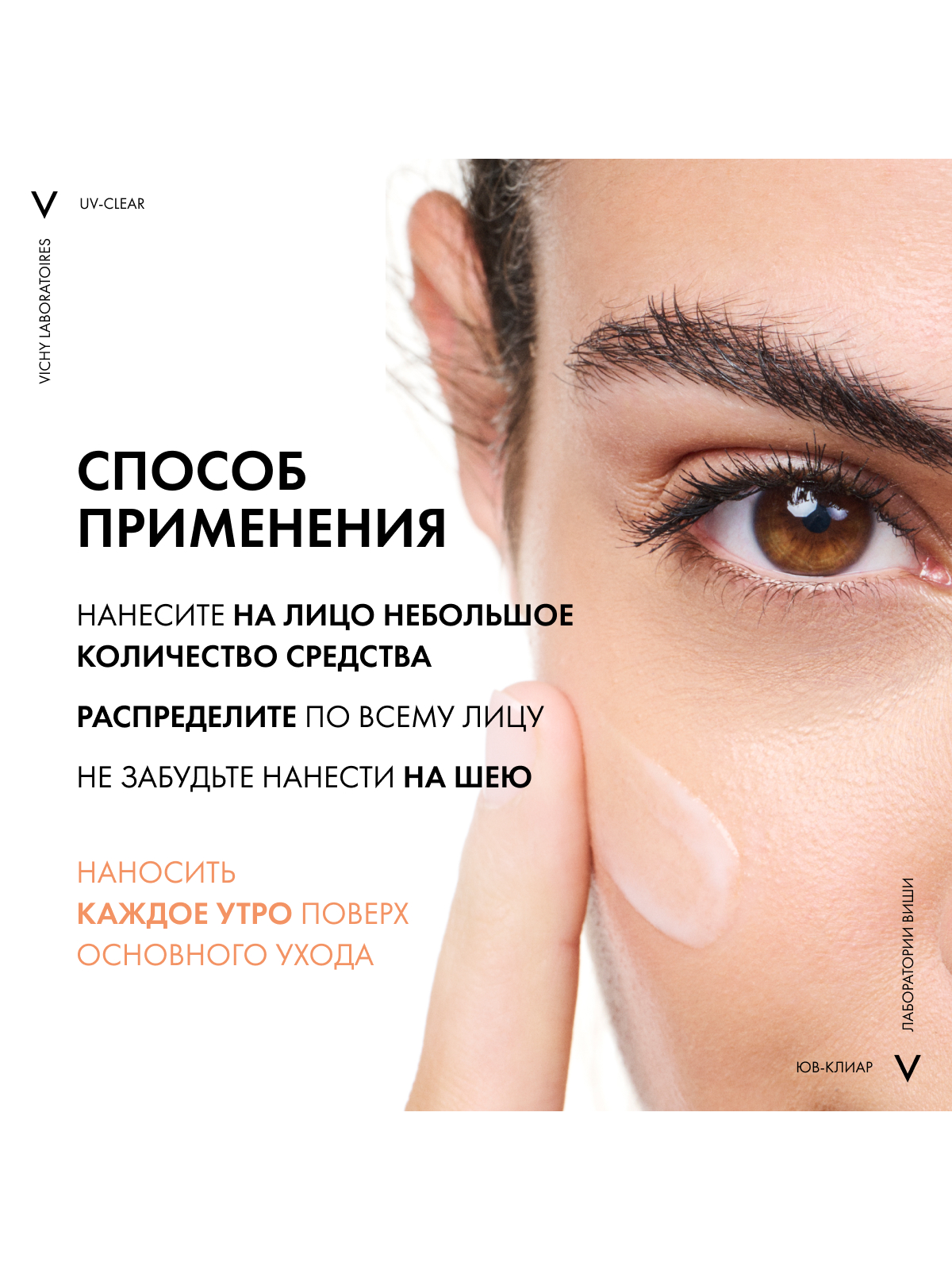 Наносить каждое утро поверх основного ухода. Хорошо взболтать перед использованием. Чрезмерное пребывание на солнце опасно. Обильно и часто повторяйте нанесение средства, особенно в случае продолжительного нахождения на солнце. Избегайте слишком долгого пребывания на солнце даже при использовании солнцезащитного средства, так как ни одно средство не может обеспечить 100% защиту кожи. Наносите солнцезащитное средство на кожу непосредственно перед выходом на солнце. Для поддержания защиты регулярно и в достаточном количестве повторяйте нанесение средства, особенно после купания, интенсивного потоотделения или вытирания полотенцем. При попадании средства в глаза немедленно и тщательно промойте их водой. Избегайте попадания средства на одежду.